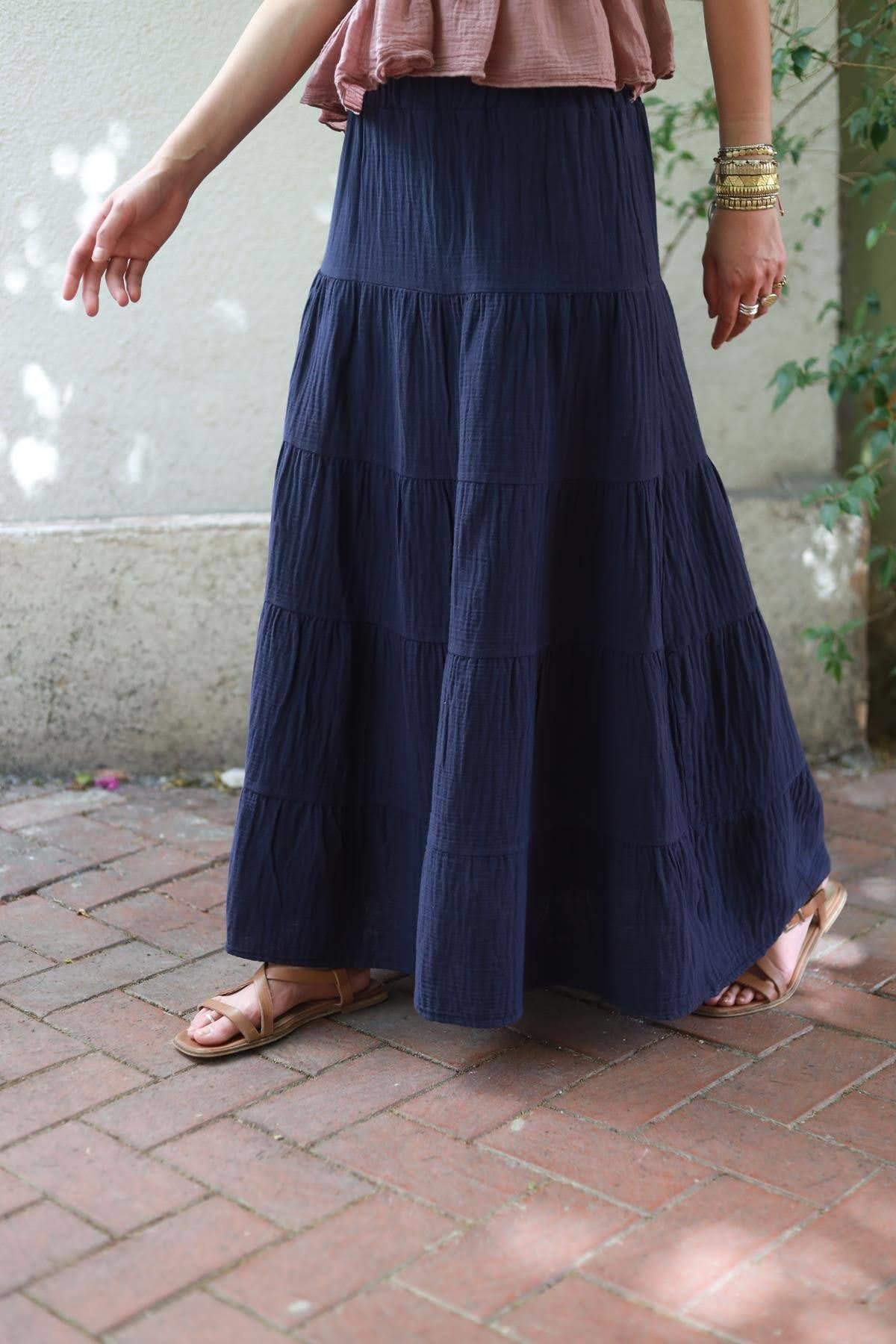 Navy Blue Layered Stitched Muslin Skirt