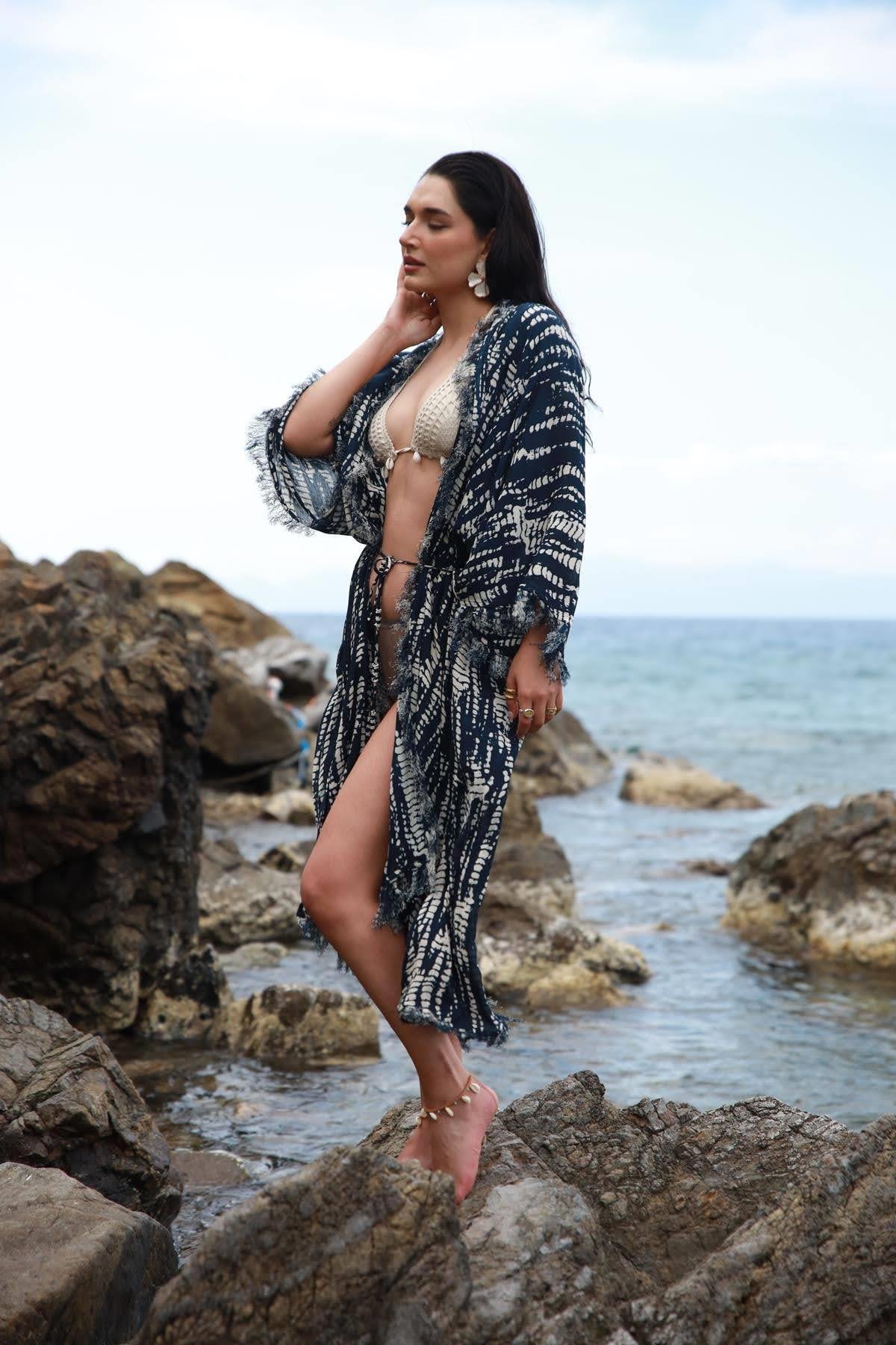 Navy Blue Patterned Slit Seashell Detailed Kimono