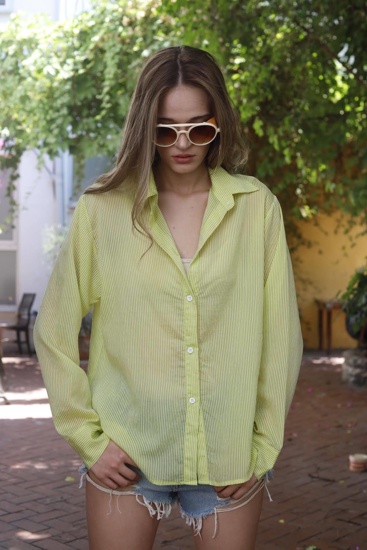 Pistachio Green Striped Back Stitched Shirt