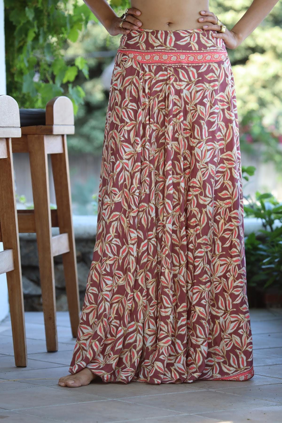 Plum Color Patterned Silk Pants Skirt