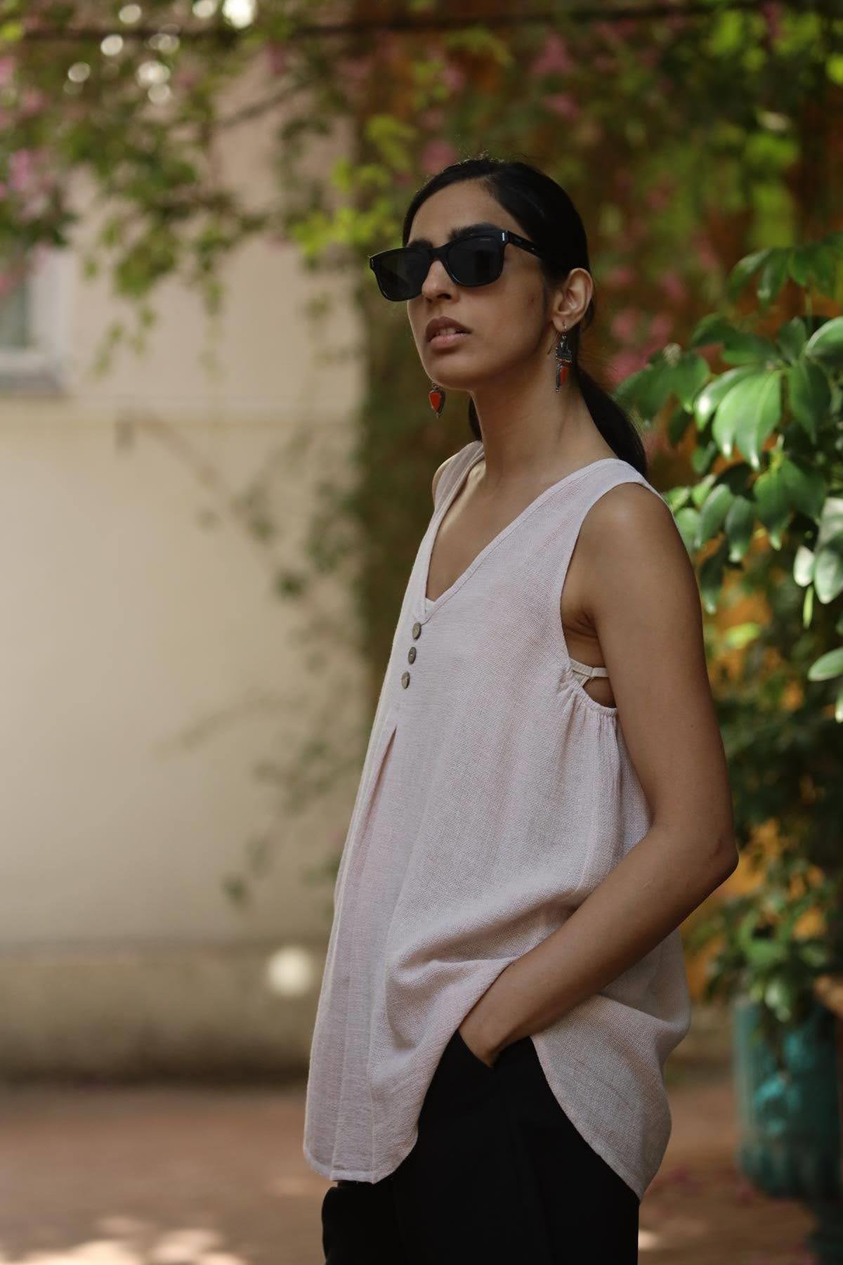 Pudra Pembe Düğmeli V Yaka Askılı Bluz