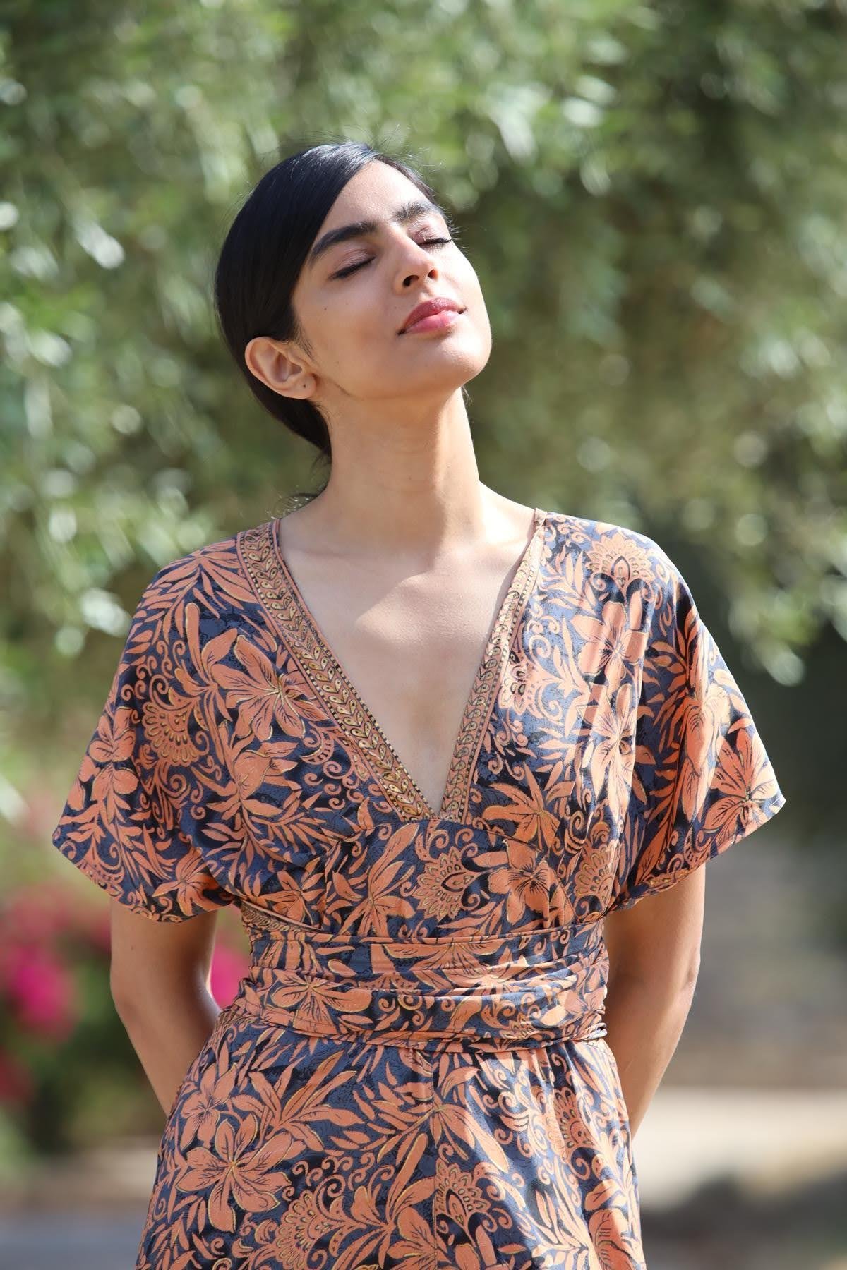Salmon Color Patterned Silk Jumpsuit