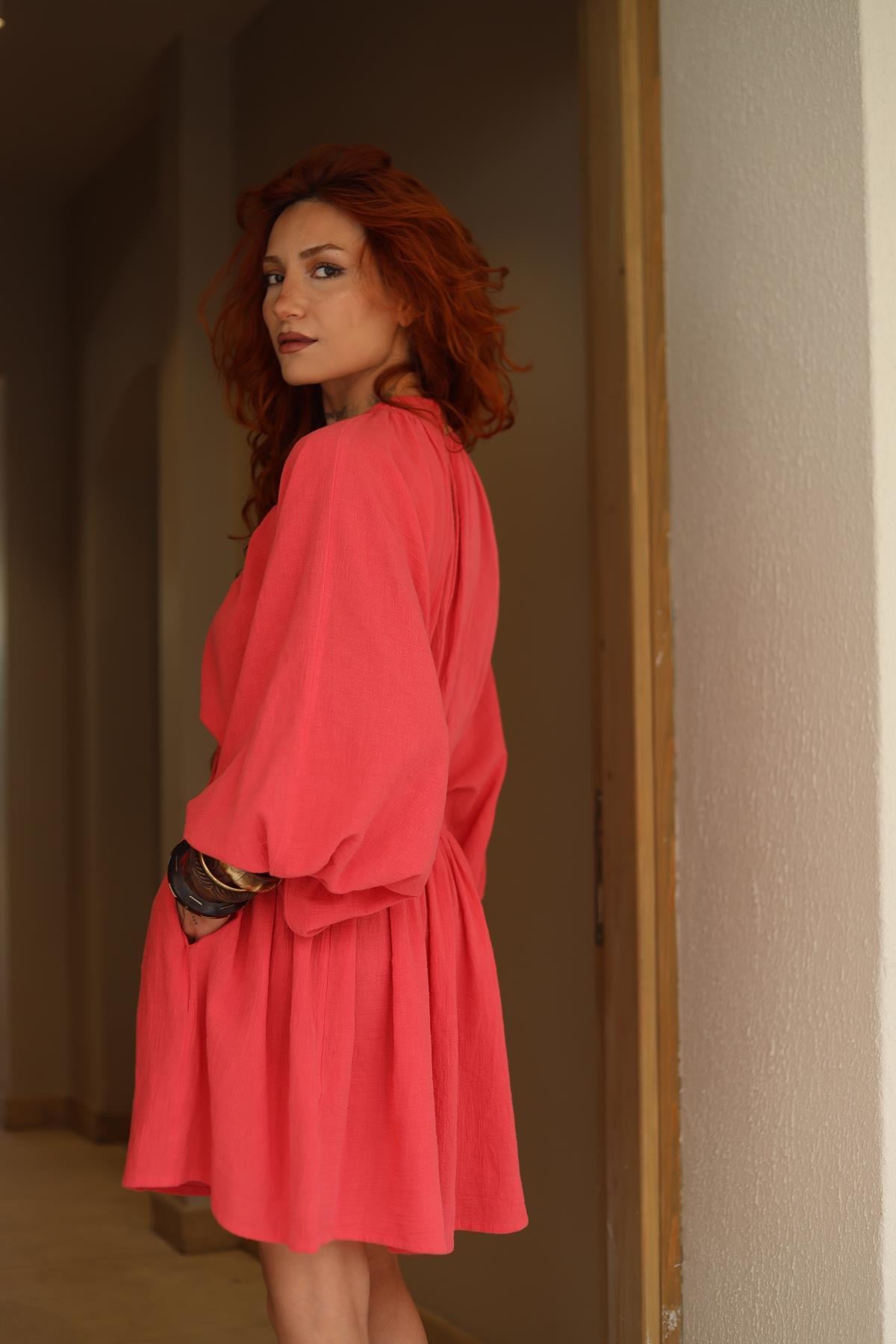 Şeker Pembe Beli ve Yakası Gipeli Kısa Elbise (KE-MS-001-PA-SPE-XS)