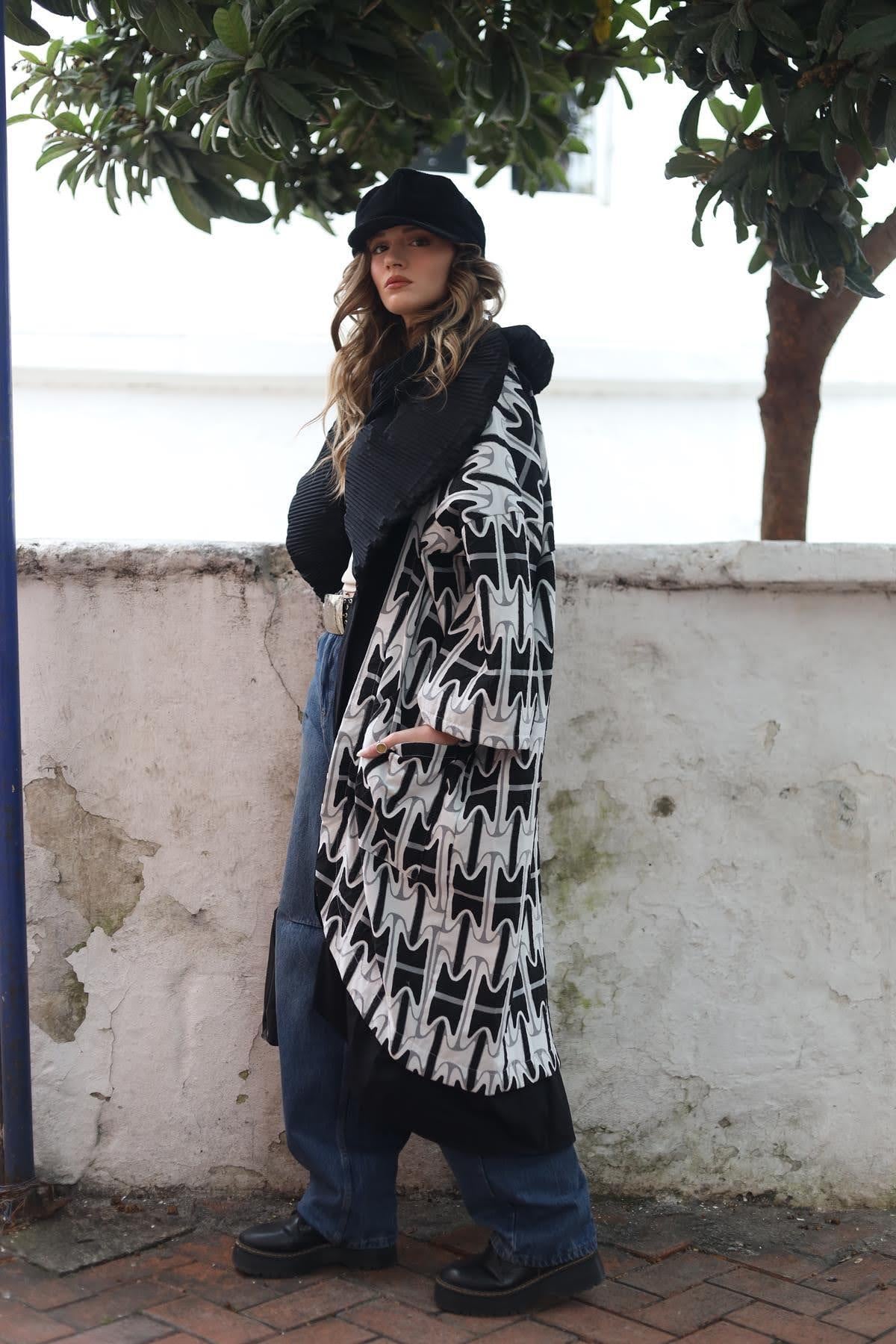 Siyah Beyaz Büyük Yakalı Desenli Mont (KC-H4-PA-SI-STD-002)