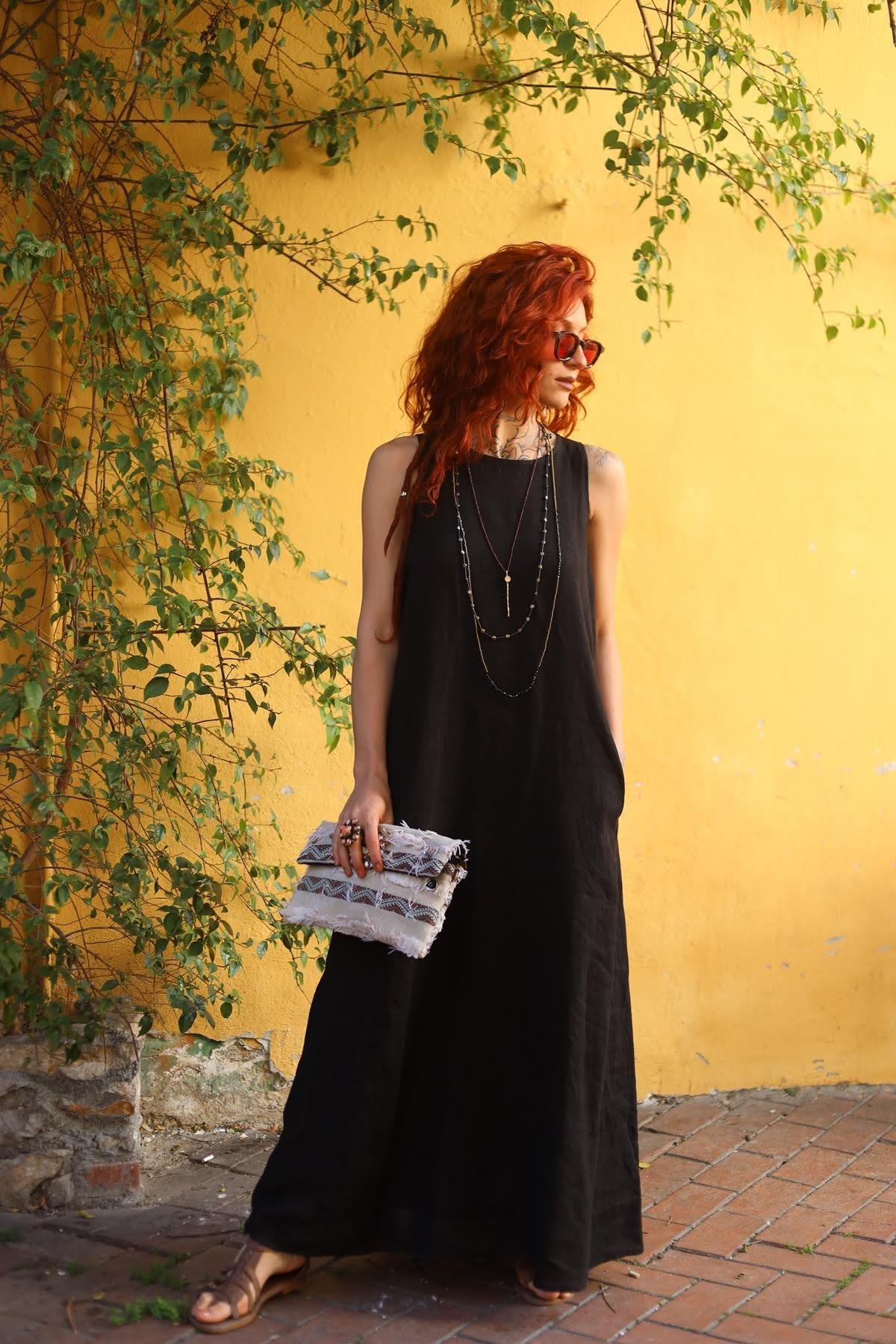 Siyah Bisiklet Yaka Cepli Kolsuz Keten Elbise