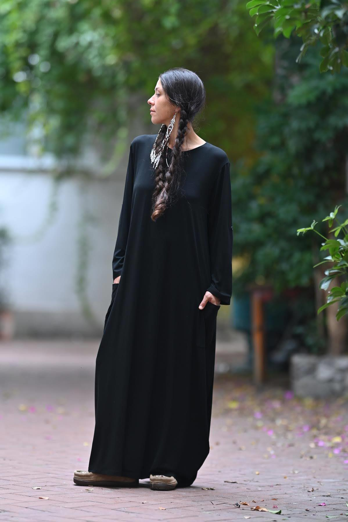 Siyah Bisiklet Yaka Kulaklı Uzun Kollu Elbise (KE-LAM-028-VI-SI-STD)