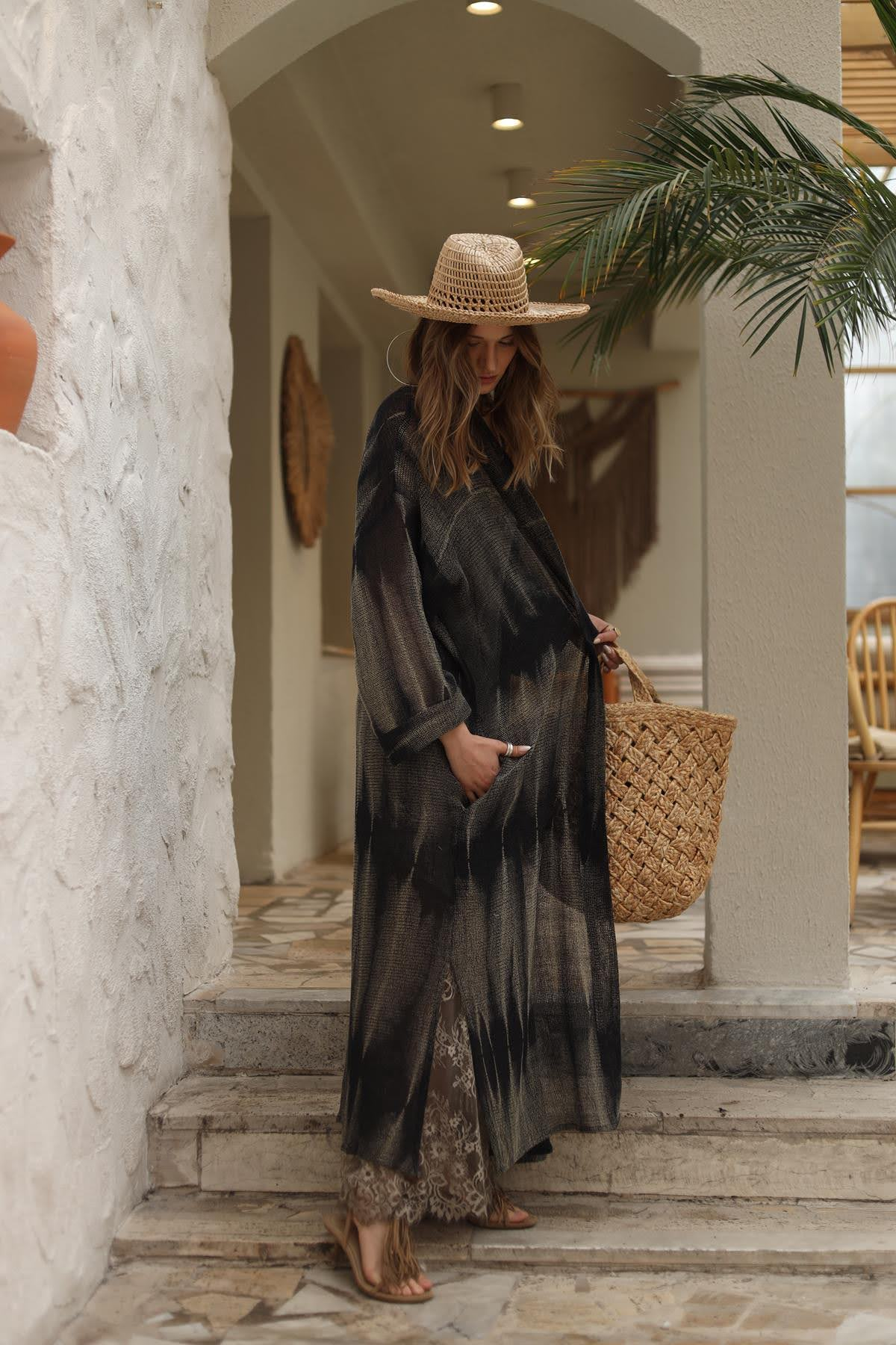 Siyah Desenli Jüt Pamuk Kaftan (KKFN-RMR-019-PA-SI-STD)