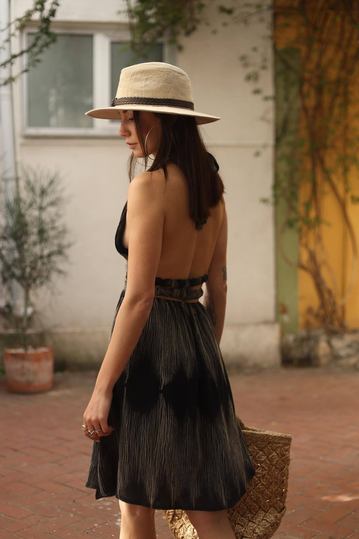 Siyah Desenli Sırt Dekolteli Mini Elbise