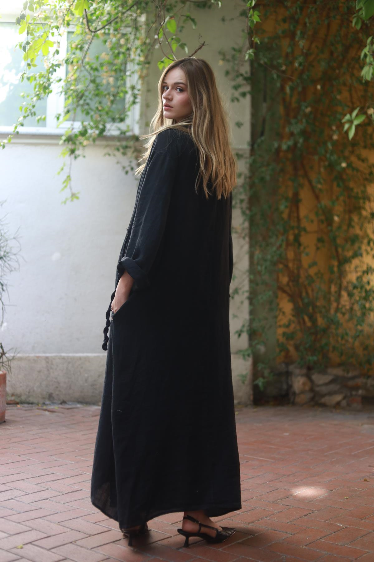 Siyah Düğme ve İp Detaylı Keten Kaftan (KKFN-FAL-017-KTN-SI-STD)