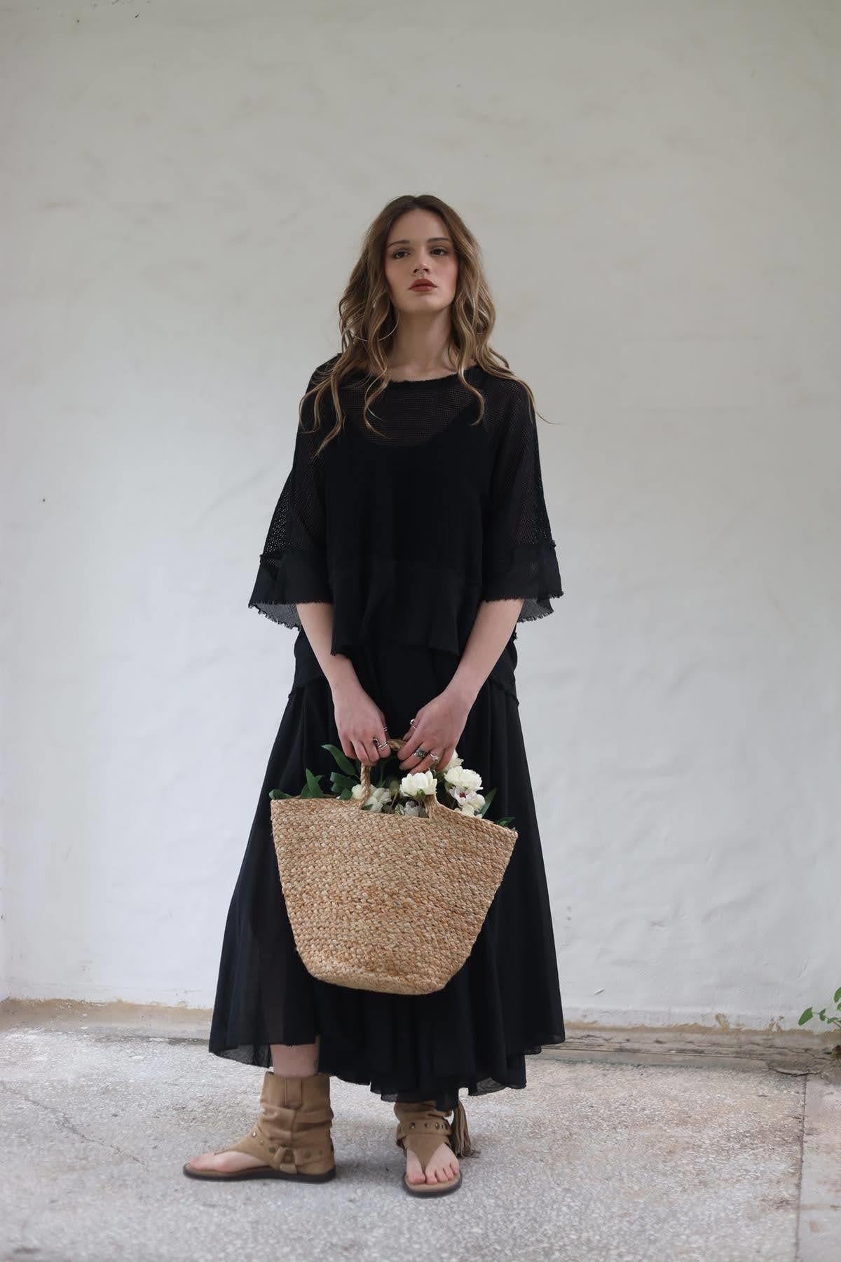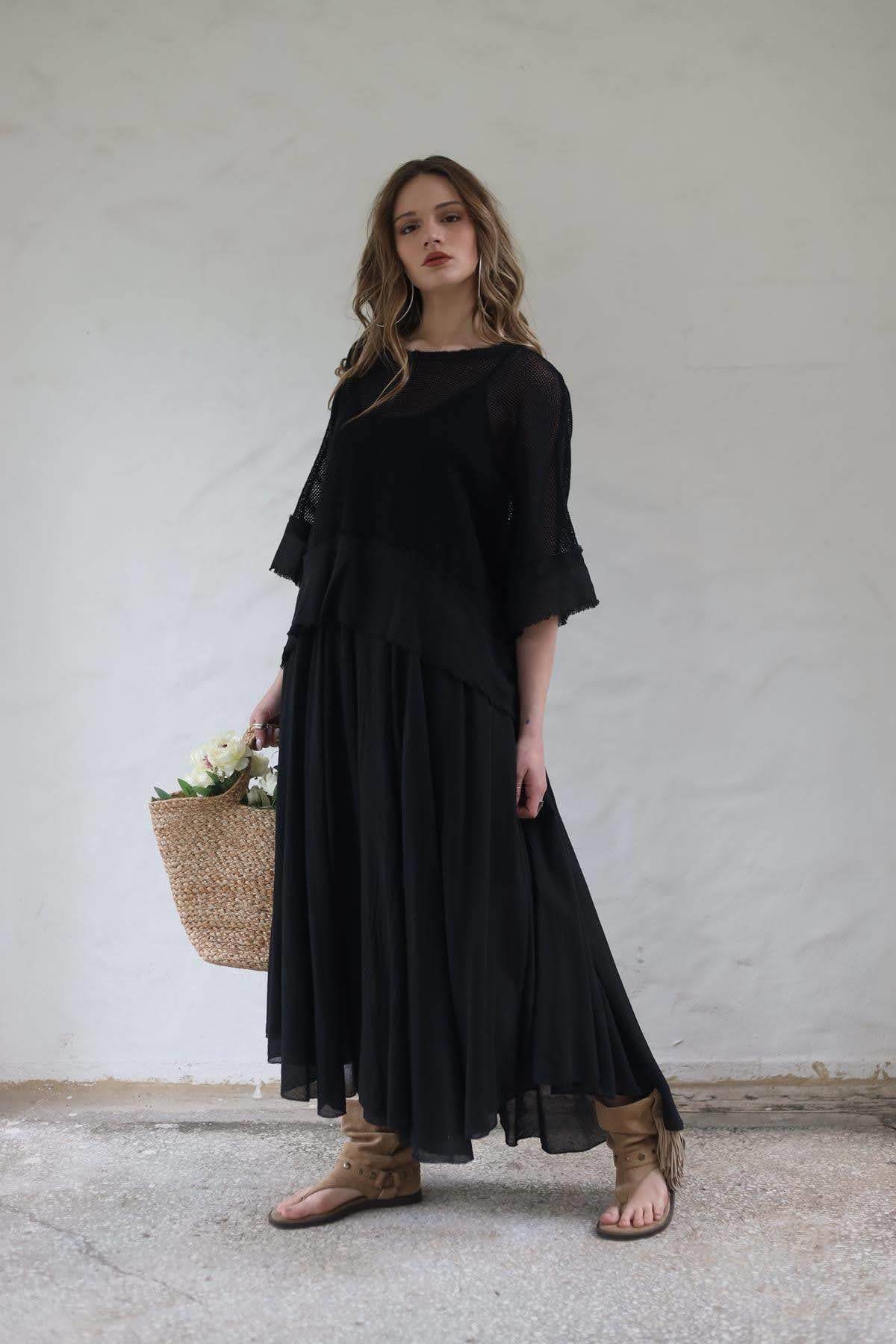 Siyah File Bluz Detaylı İp Askılı Elbise