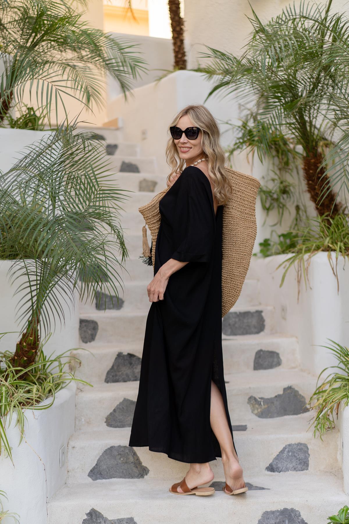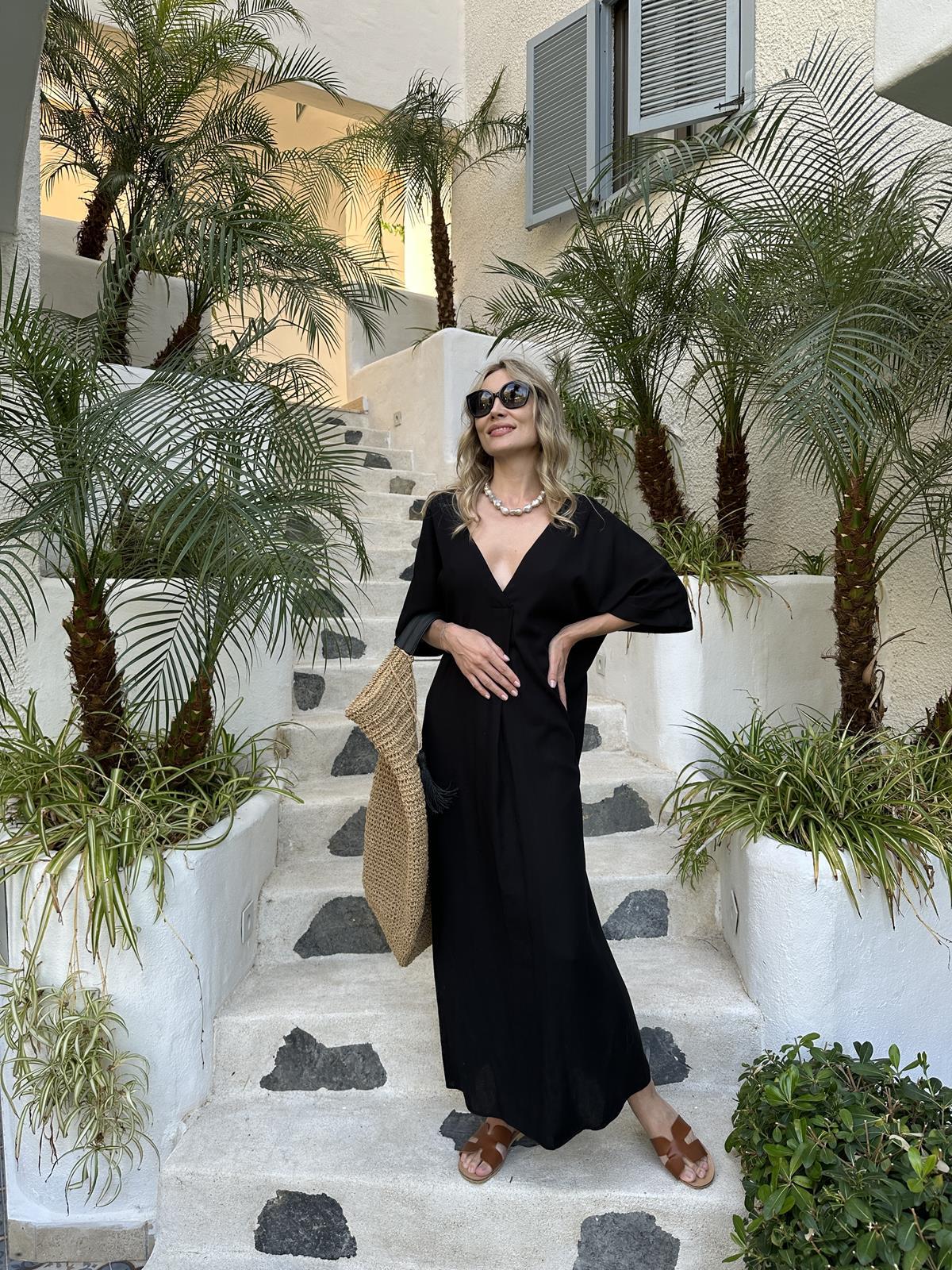 Siyah Önü Arkası V Yırtmaçlı Keten Elbise (KE-LAM-022-KTN-SI-STD)