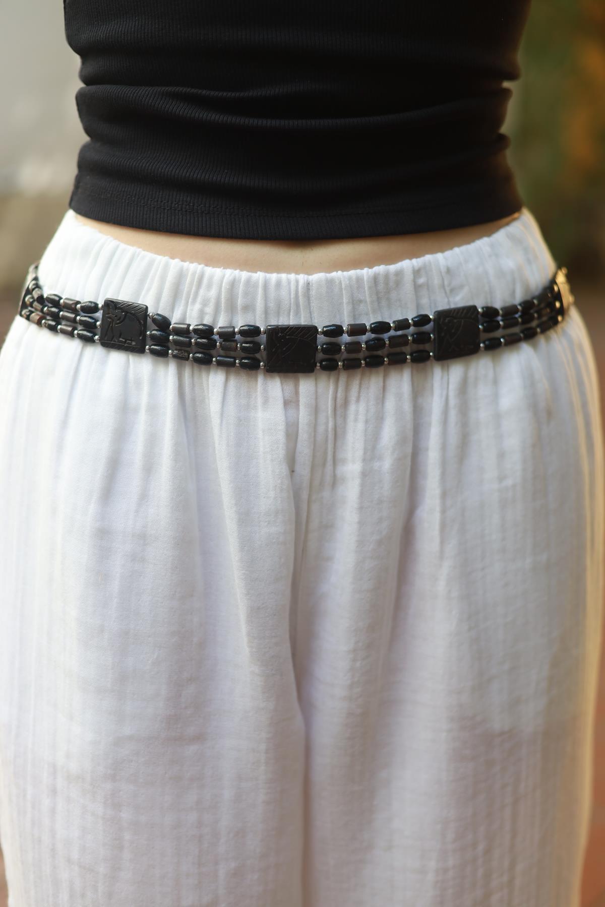 Siyah Oyma Taş Detaylı Boncuk Kemer