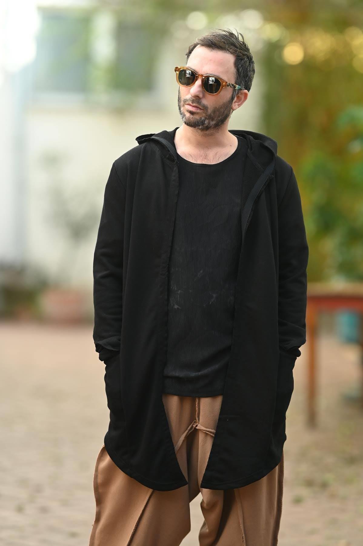 Siyah Pis Dikiş Detaylı Kapüşonlu Erkek Panço