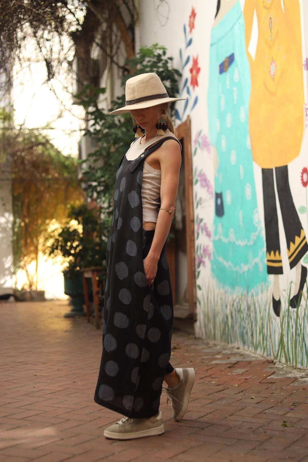 Siyah Puantiyeli Keten Salopet Tulum