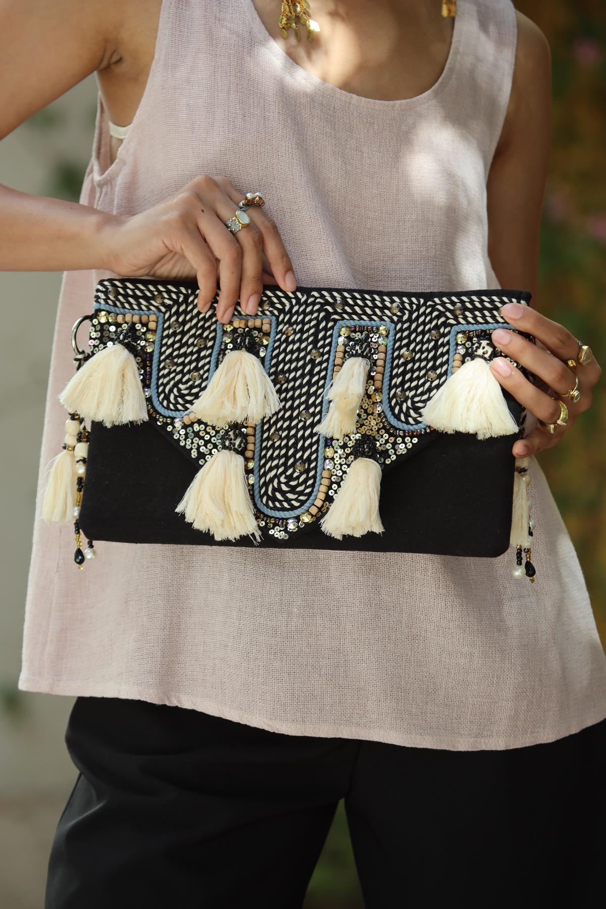 Siyah Püsküllü İşlemeli Tasarım Zarf Çanta