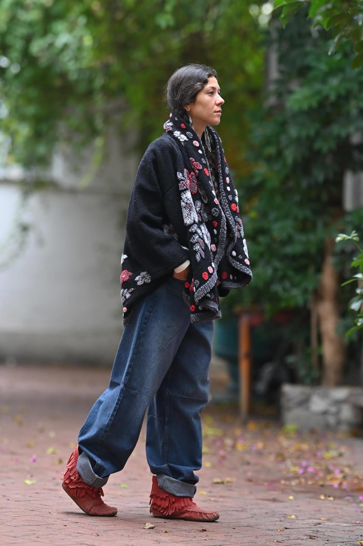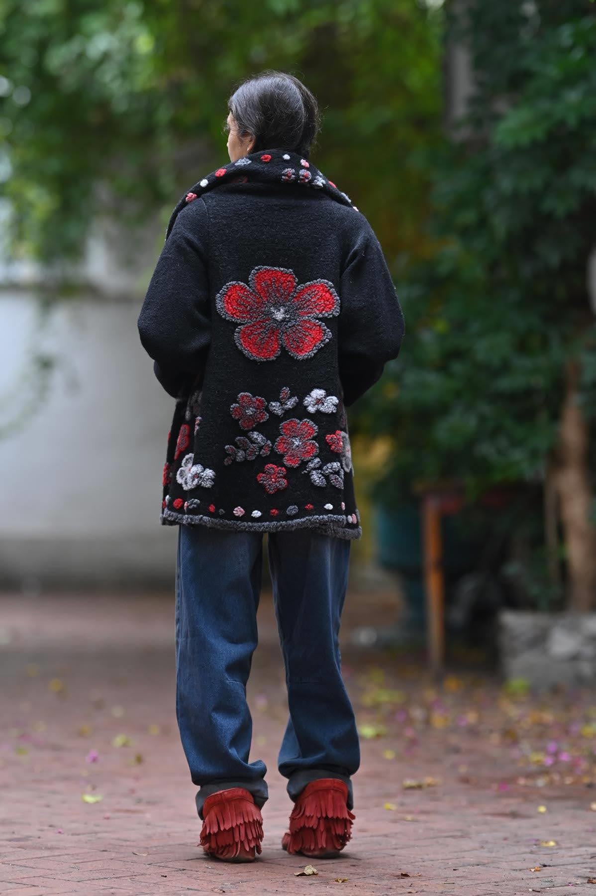 Siyah Şal Yaka Çiçek Desenli Keçe Ceket
