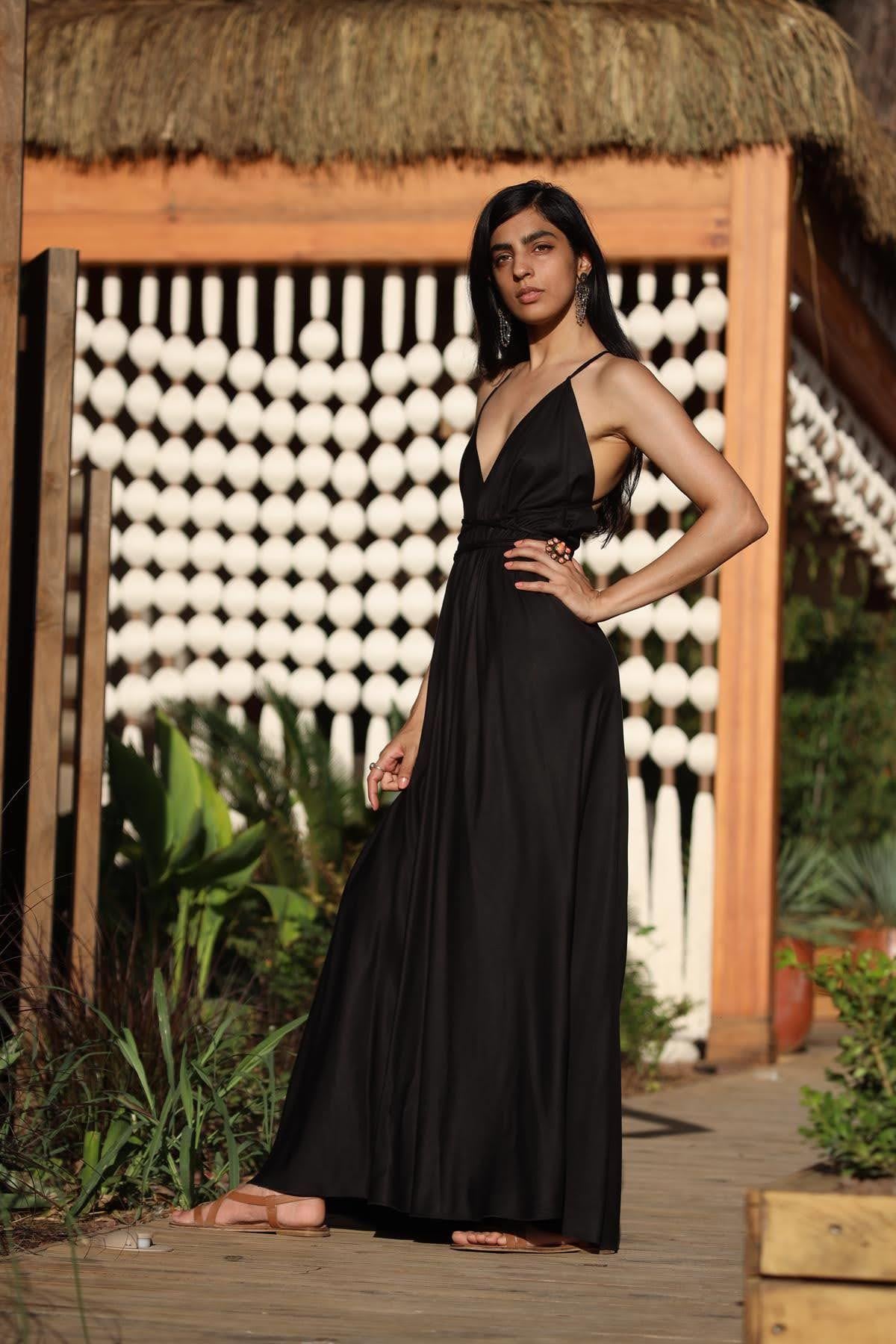 Siyah Sırt Dekolteli Bağlamalı Saten Elbise
