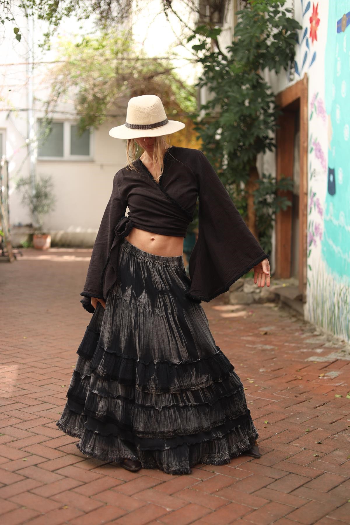 Siyah Taşlanmış Eteği Püsküllü Etek