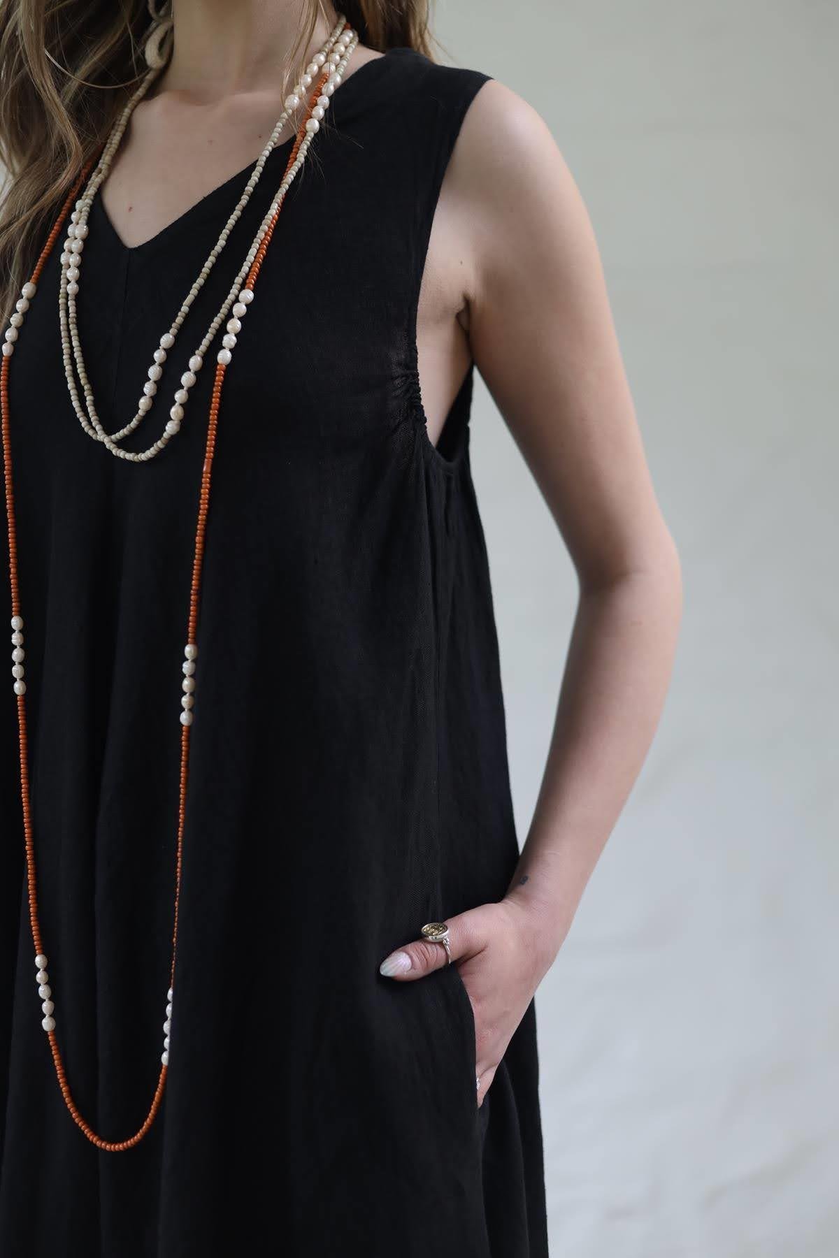 Siyah V Yaka Cepli Kolsuz Keten Elbise