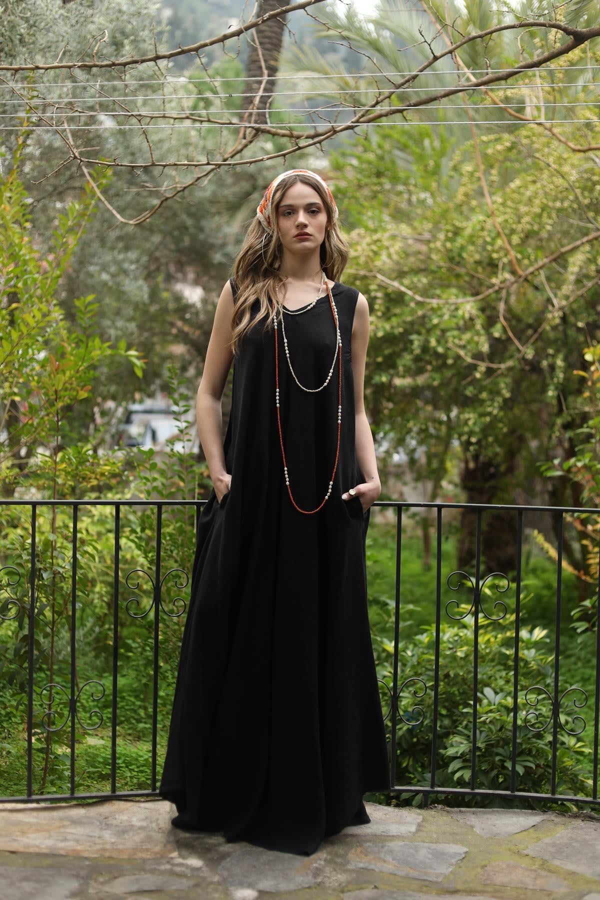 Siyah V Yaka Cepli Kolsuz Keten Elbise (KE-FAL-032-KTN-SI-STD)
