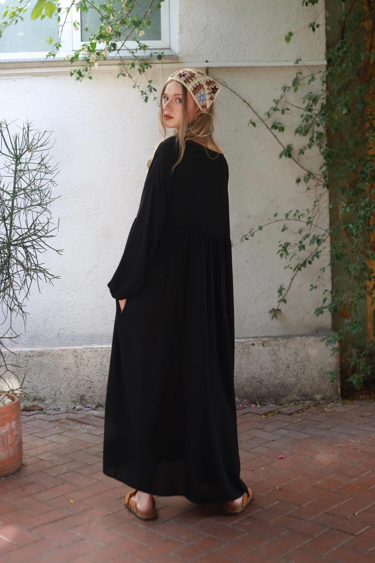 Siyah V Yaka Kolları Büzgülü Keten Elbise (KE-LAM-024-KTN-SI-STD)