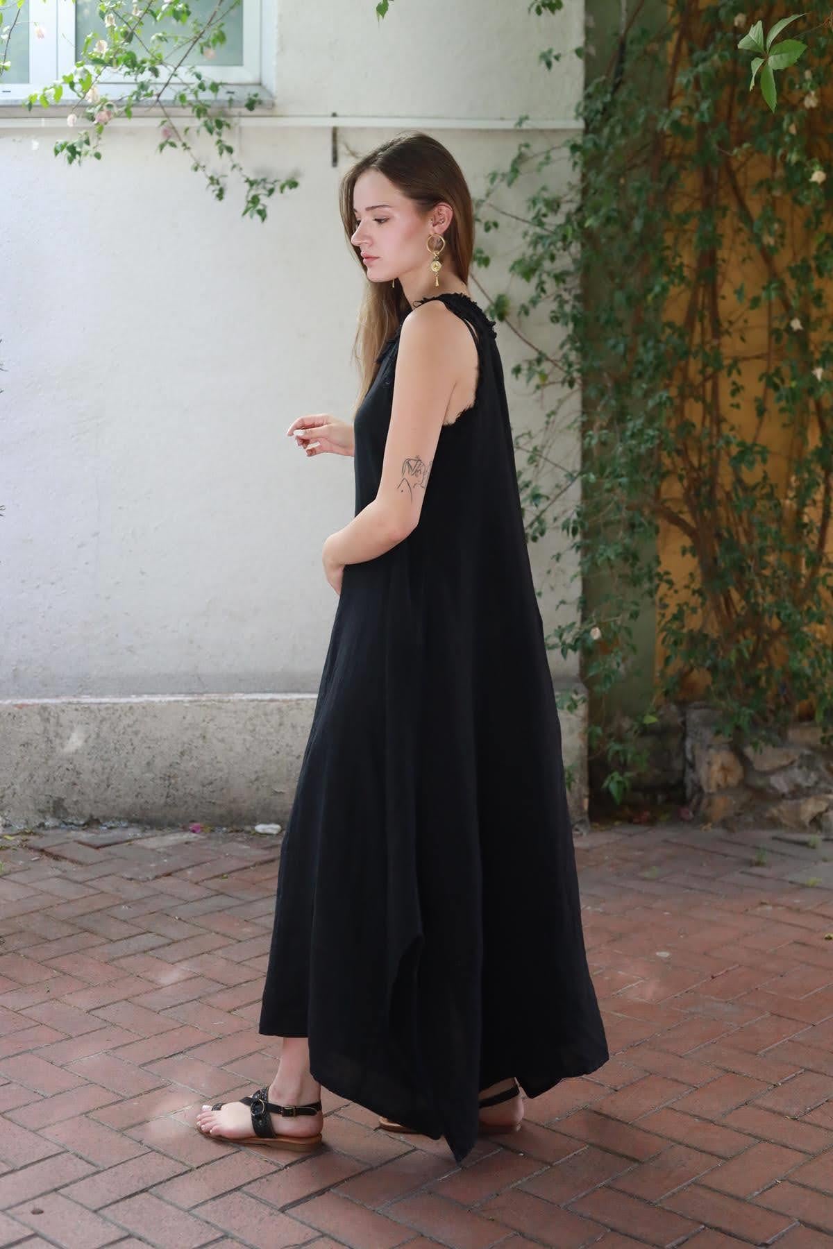 Siyah Yakası Düğmeli Püsküllü Keten Elbise (KE-ILG-001-KTN-SI-STD)