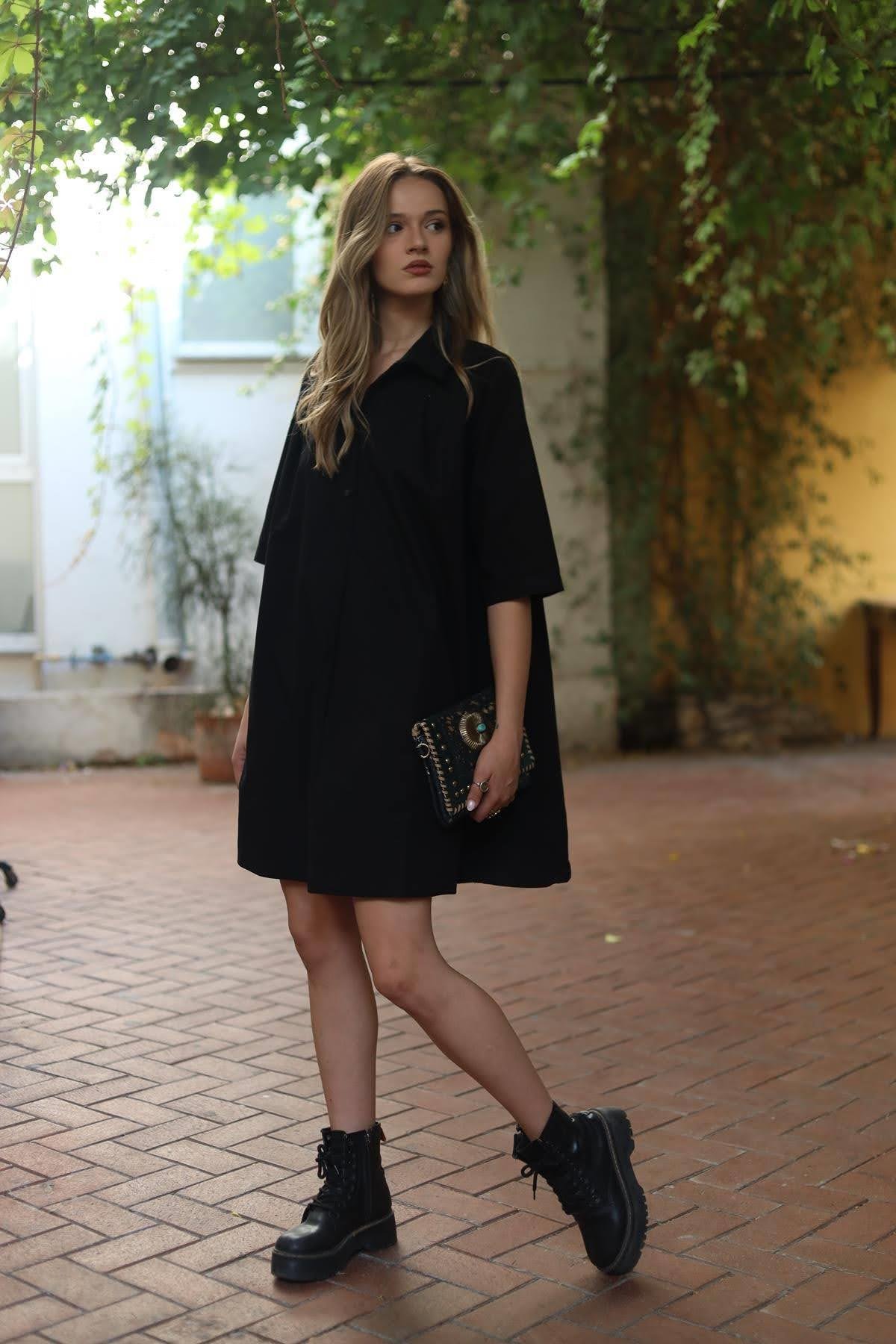 Siyah Yarım Düğmeli Kısa Gömlek Elbise