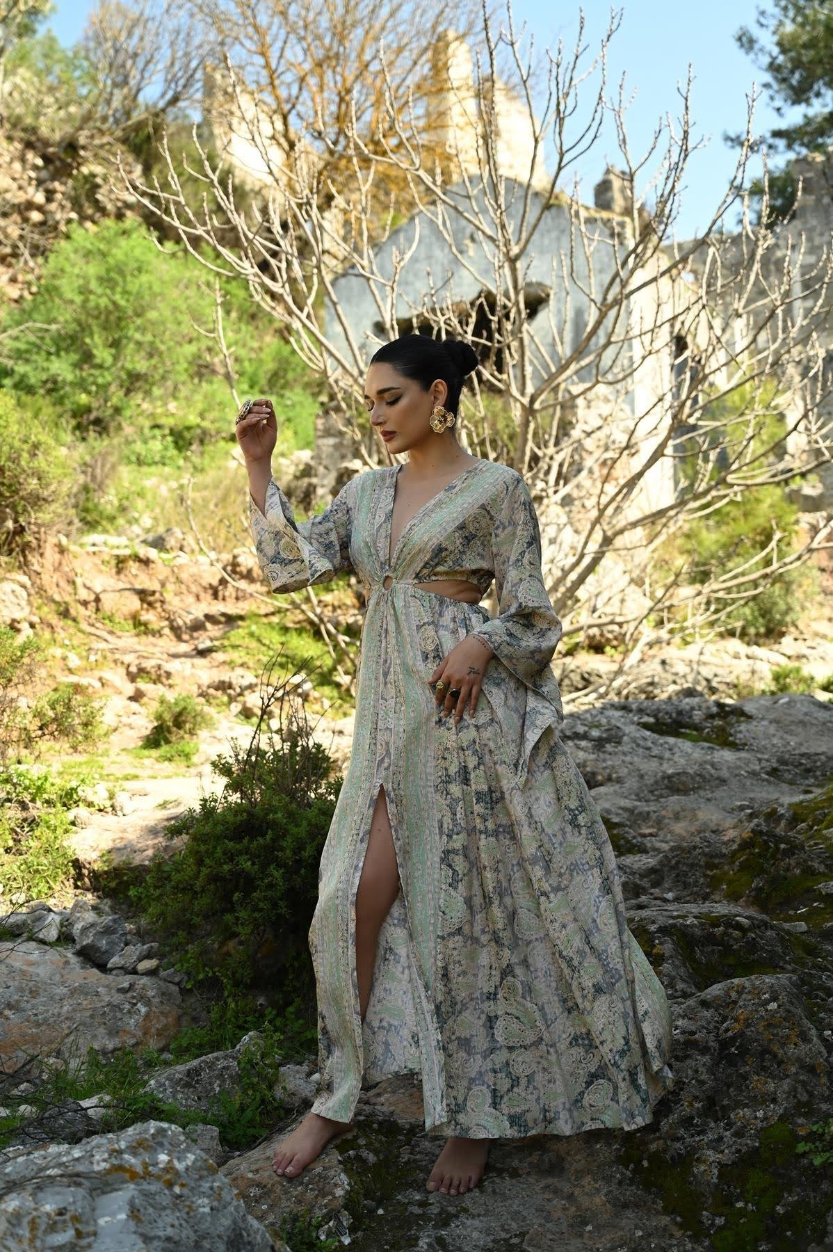 Su Yeşili Derin V Yaka Halka Detaylı Bel Dekolteli İpek Elbise (KE-MOT-011-IP-SY-STD)