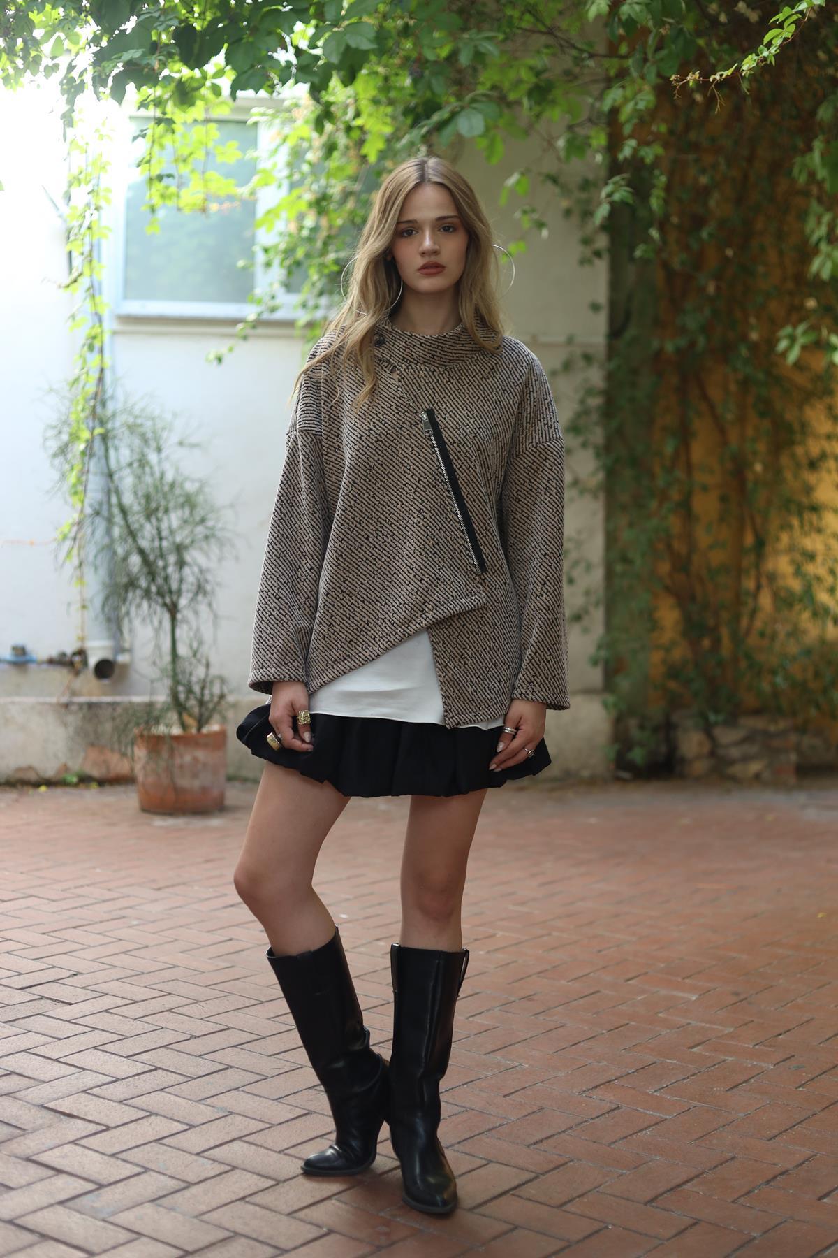 Sütlü Kahve Asimetrik Fermuarlı Kadife Ceket