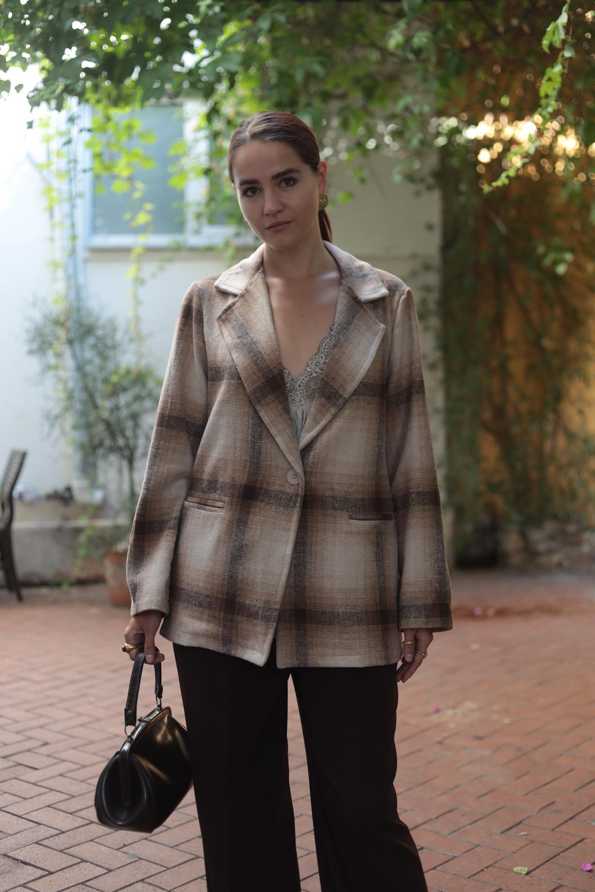 Sütlü Kahve Ekose Keçe Ceket