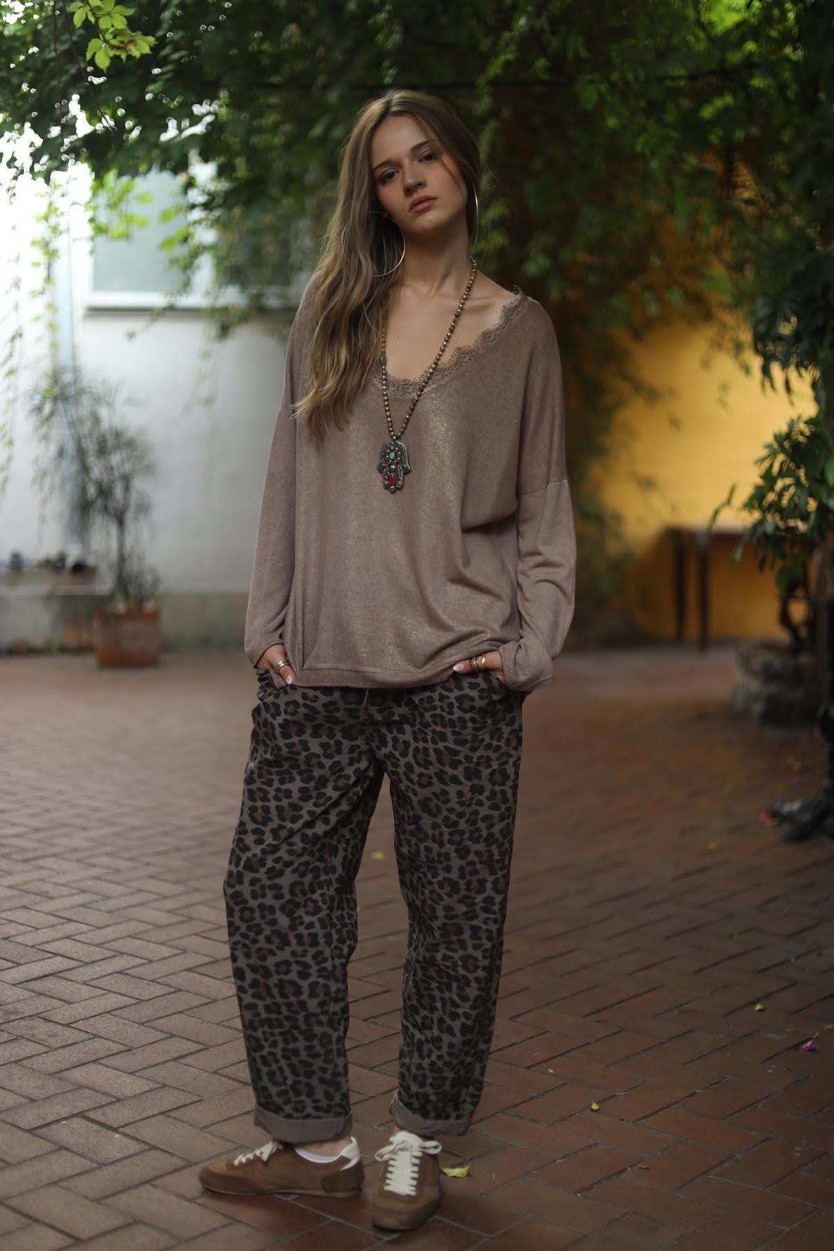 Sütlü Kahve Yakası Dantelli Simli Yağ Yıkama Triko Bluz (KB-FAL-019-VI-SKA-STD)