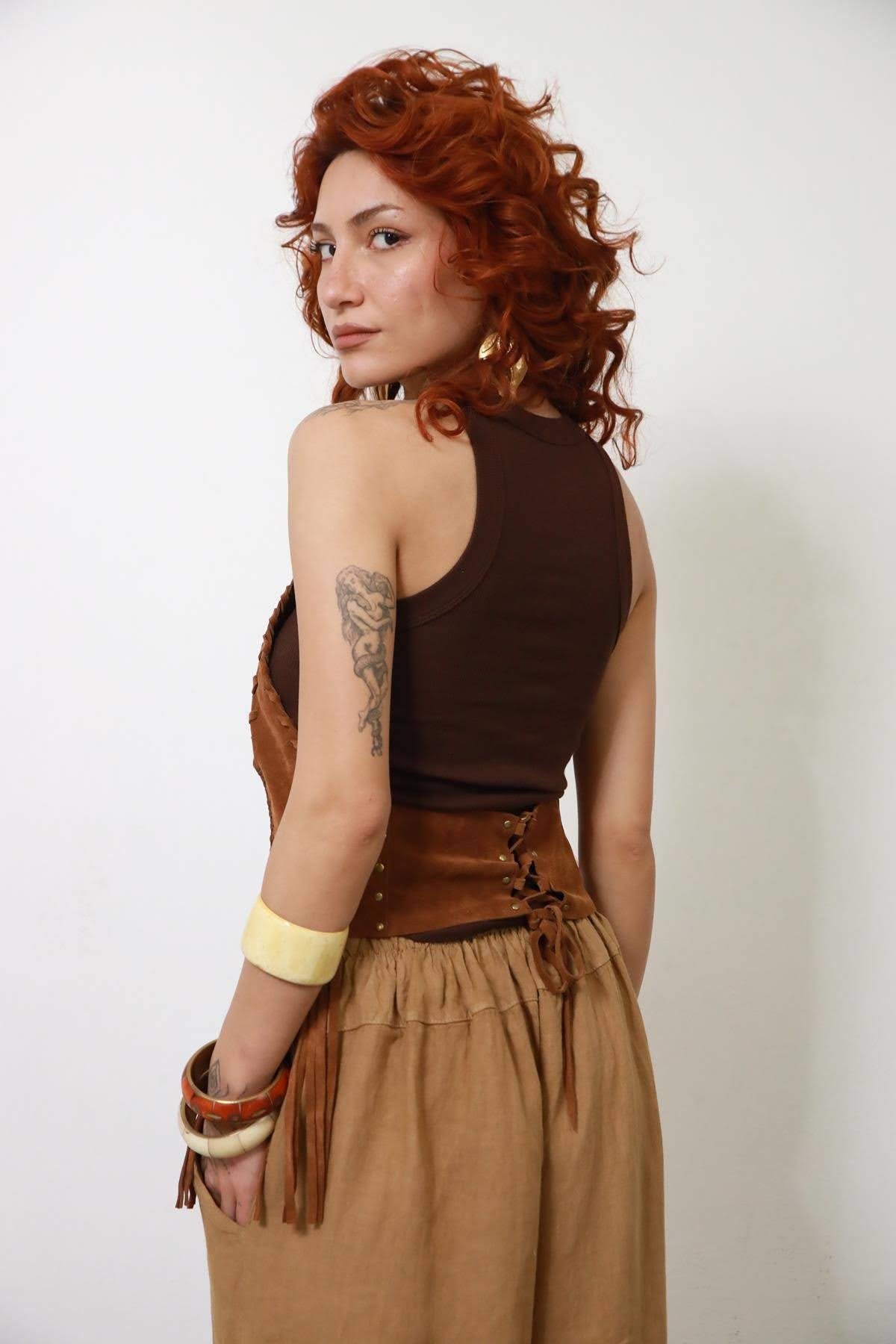 Taba Boyundan Askılı Tasarım Süet Deri Yelek