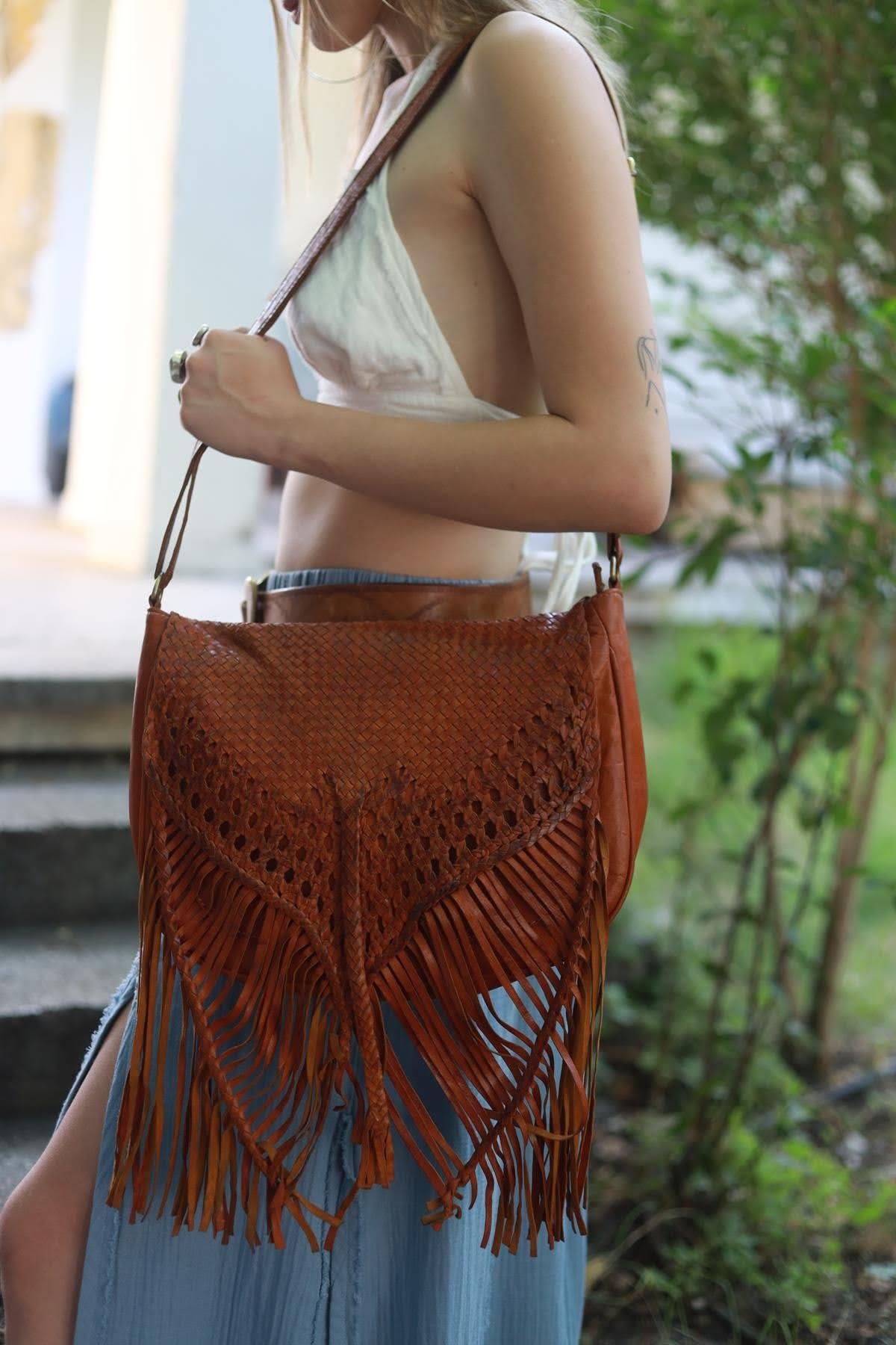 Tan Tasseled Leather Woven Bag