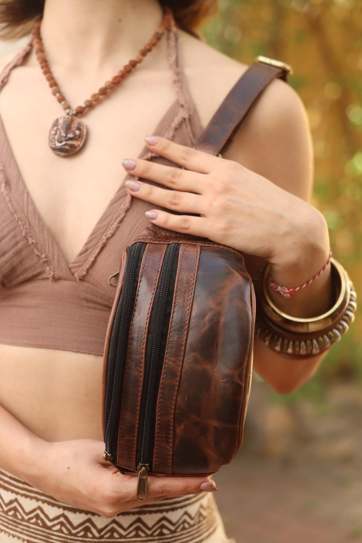 Tan Three Compartment Strappy Leather Bag (ACNT-AS-036-DE-TAB-STD)