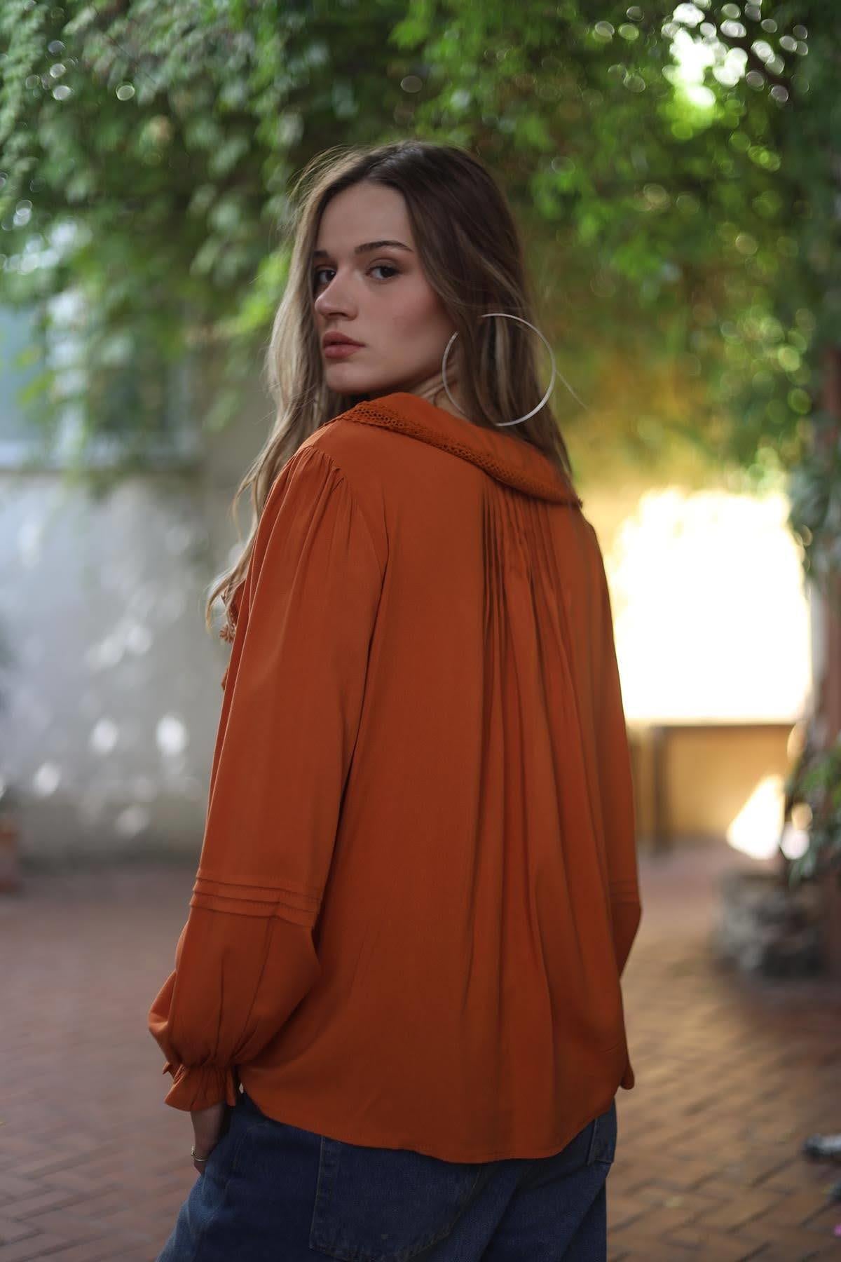 Tarçın Rengi Dantel Detaylı Yakalı Fırfırlı Bluz