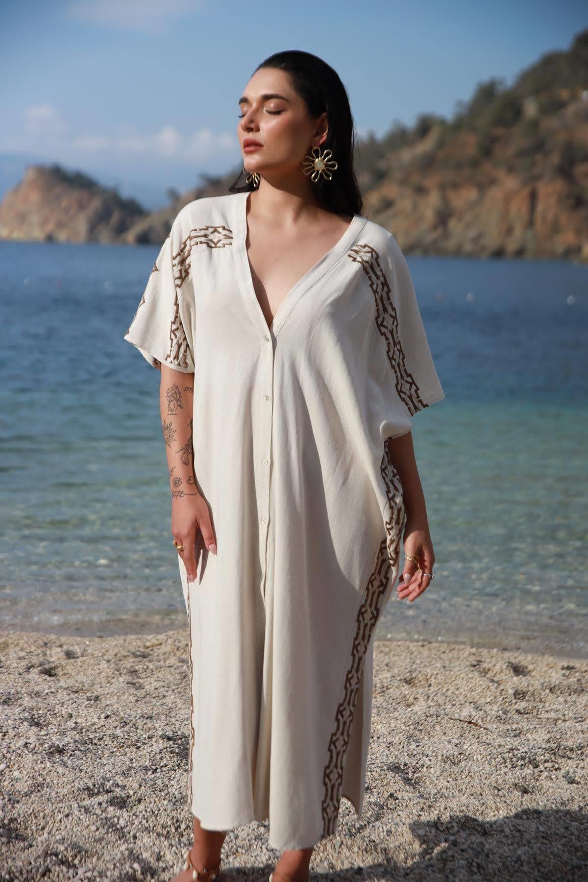 Taş Rengi Nakışlı Keten Gömlek Elbise (KE-ON-001-KTN-TAS-STD)