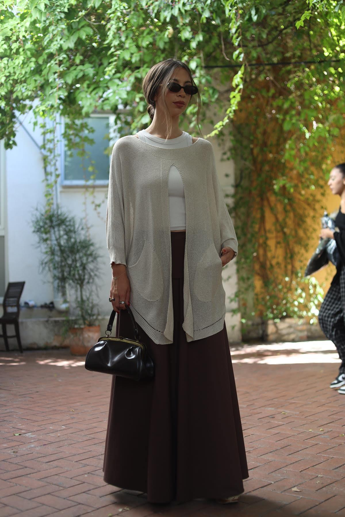Taş Rengi Önü Yırtmaçlı Cepli Triko Tunik