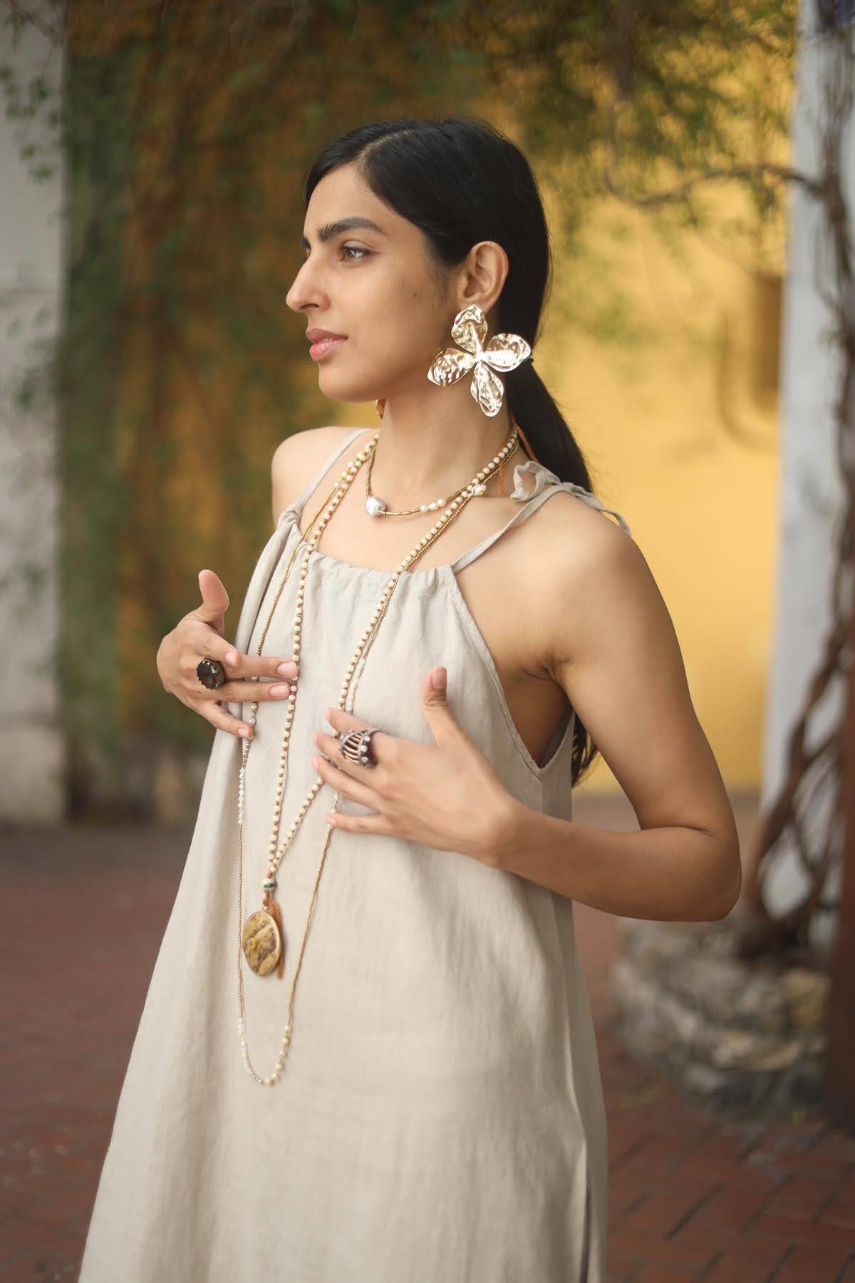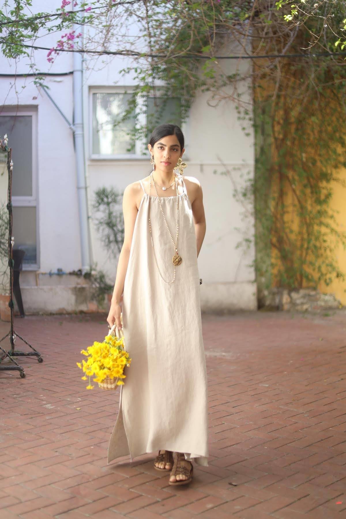 Taş Rengi Yakası Büzgülü Yırtmaçlı Keten Elbise