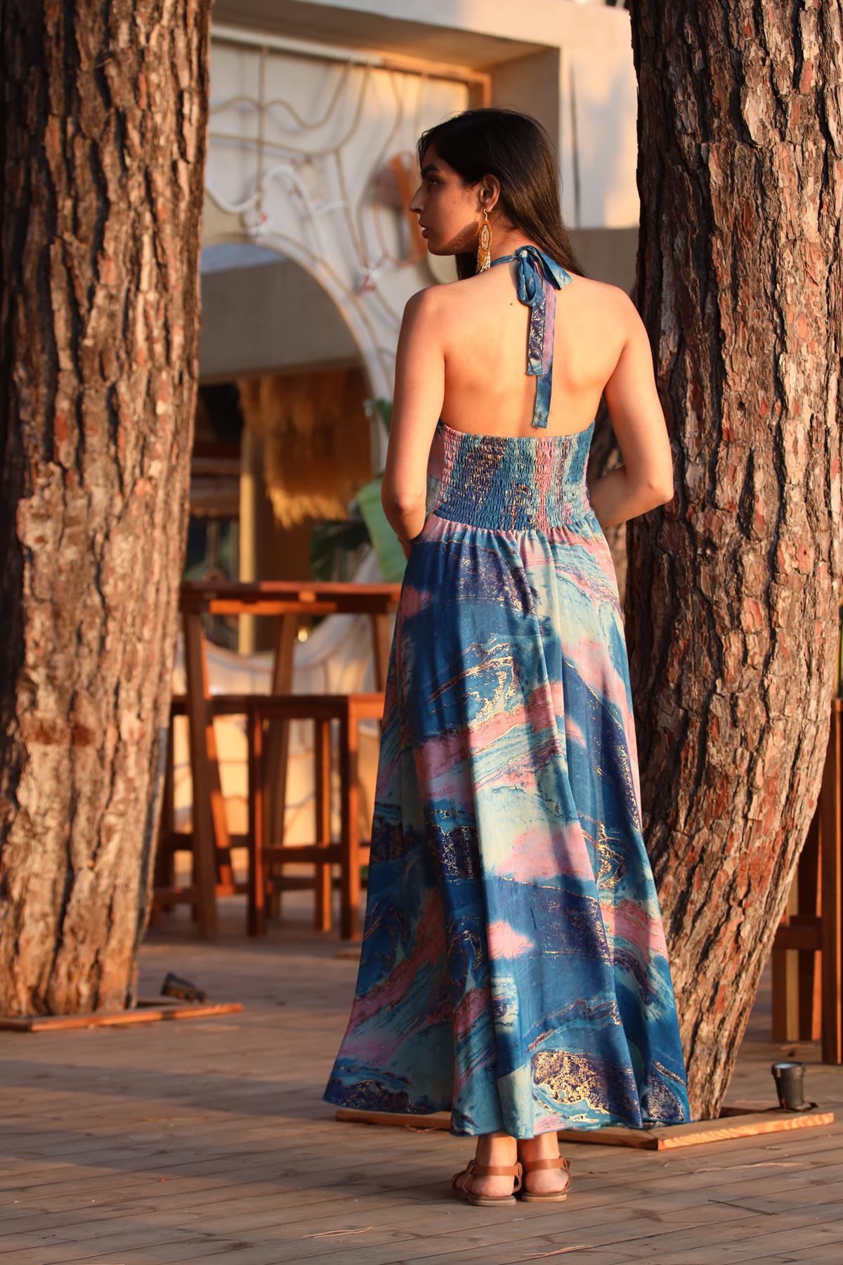 Turkuaz Derin V Yaka Gipeli Boyundan Bağlamalı İpek Elbise (KE-RMR-041-IP-TUR-STD)