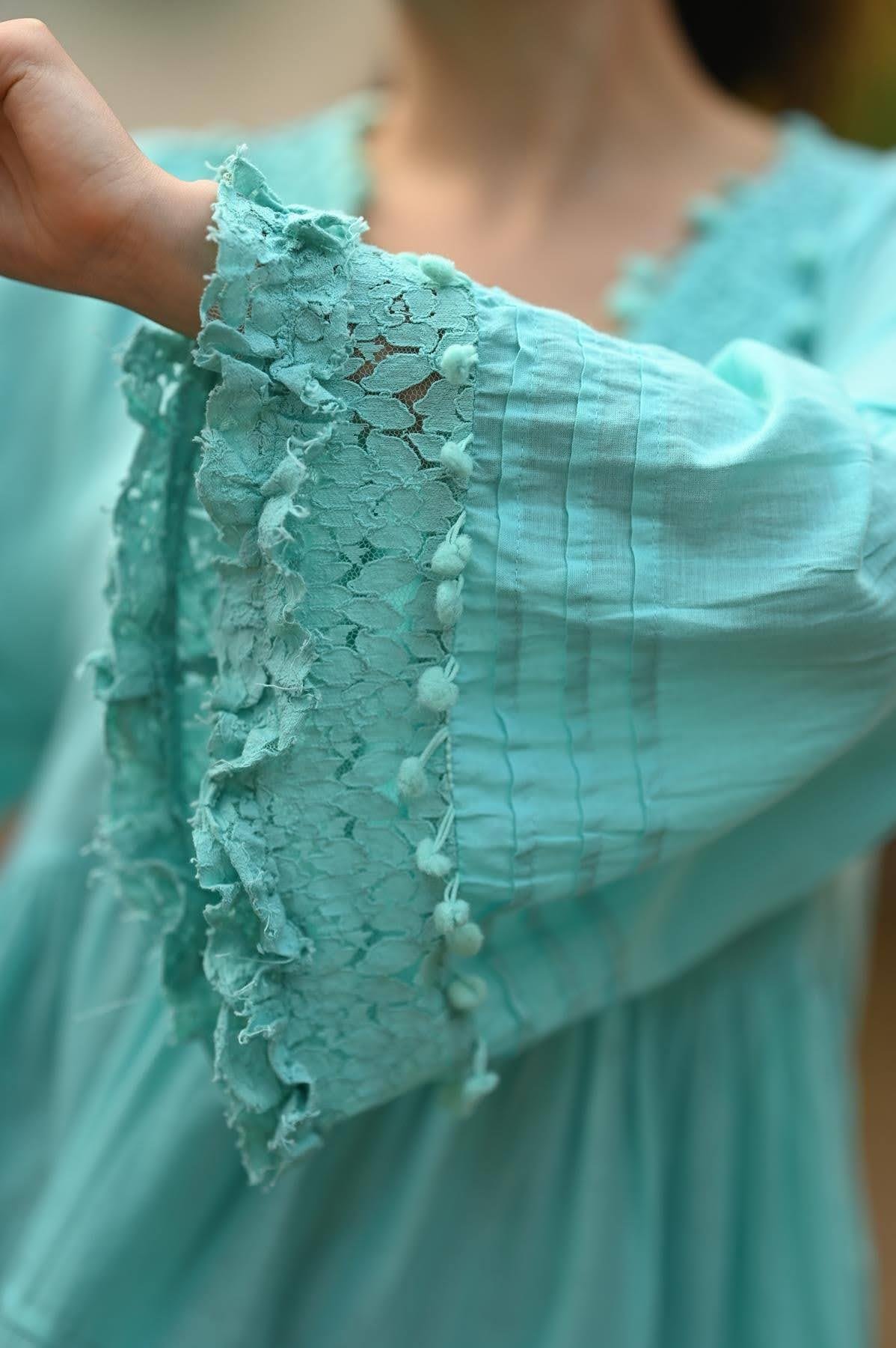 Turkuaz İşlemeli Derin V Yaka Dantelli Mini Elbise (KE-SOL-003-PA-TUR-STD)