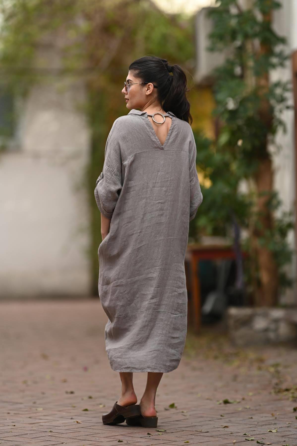 Vizon Rengi Arkası Halkalı Dikiş Detaylı Keten Gömlek Elbise