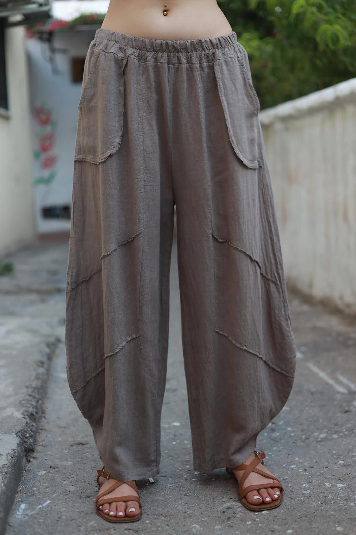 Vizon Rengi Asimetrik Dikişli Keten Bluz ve Pantolon Takım