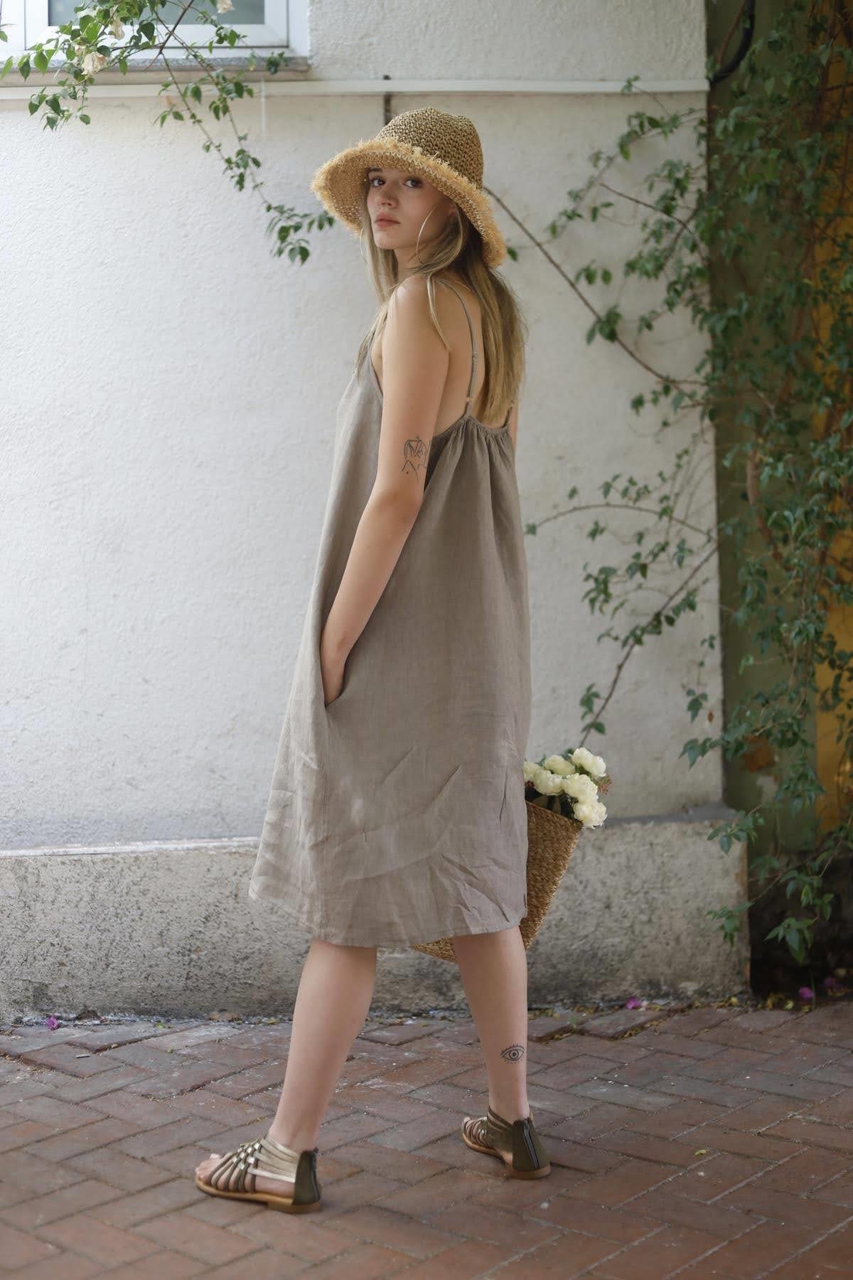 Vizon Rengi Askılı Saçak Detaylı Kısa Keten Elbise