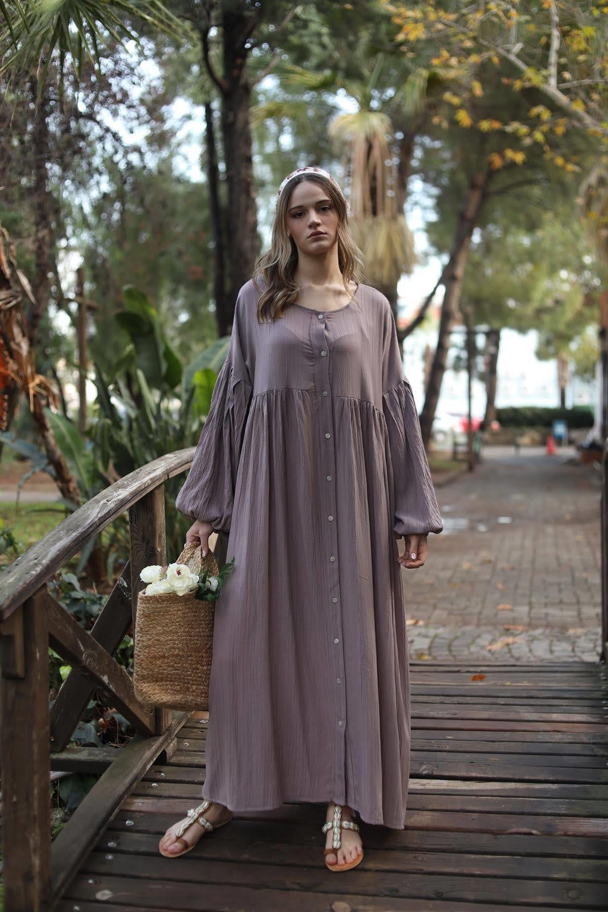 Vizon Rengi Balon Kol Gofre Gömlek Elbise