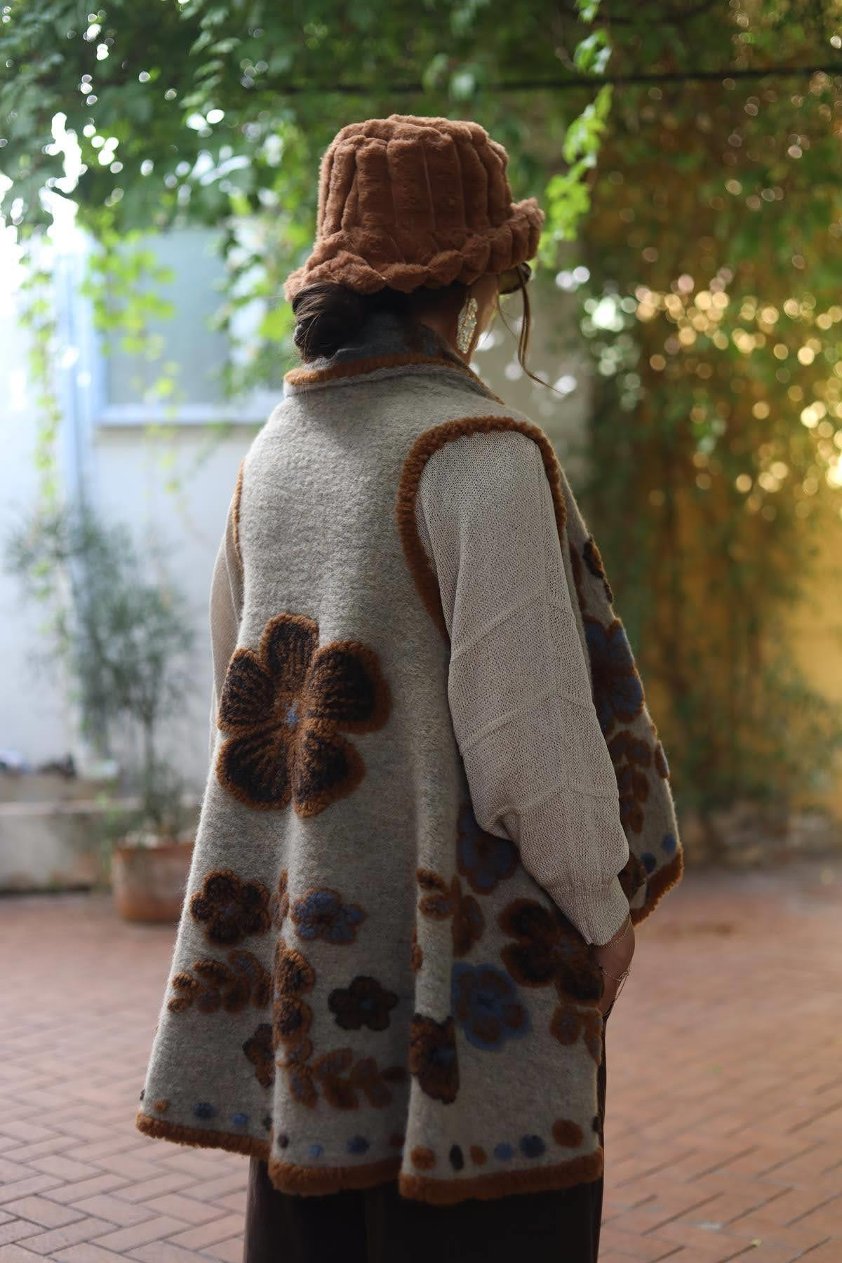 Vizon Rengi Çiçek Desenli Keçe Yelek