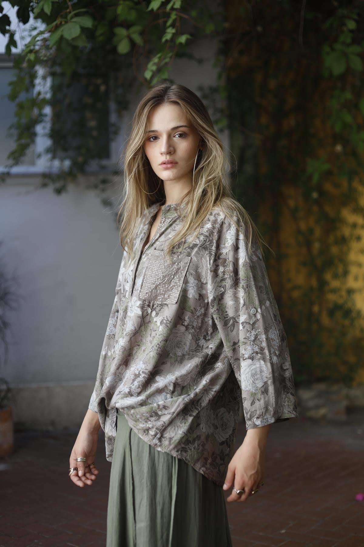 Vizon Rengi Çiçek Desenli Pul Detaylı Gömlek