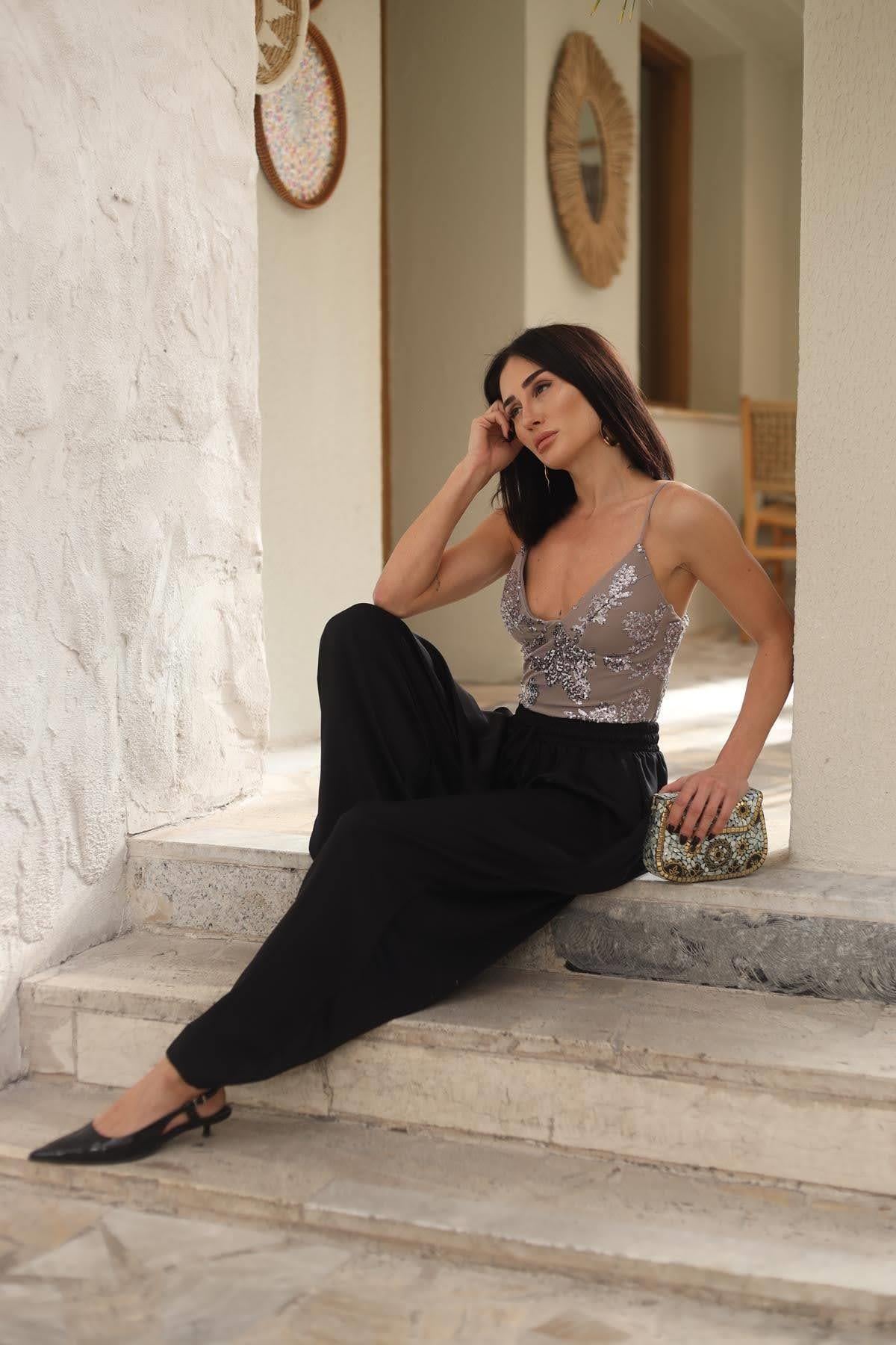 Vizon Rengi Payetli Ayarlanabilir Askılı Bodysuit