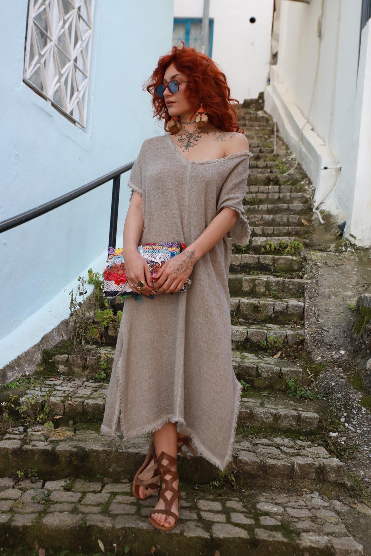 Vizon Rengi Püsküllü V Yaka Yırtmaçlı Elbise