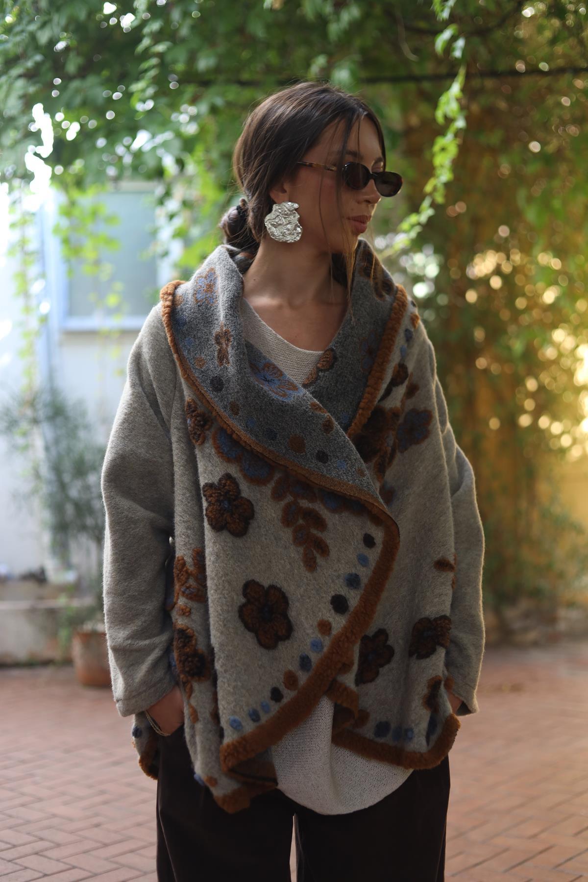 Vizon Rengi Şal Yaka Çiçek Desenli Keçe Ceket