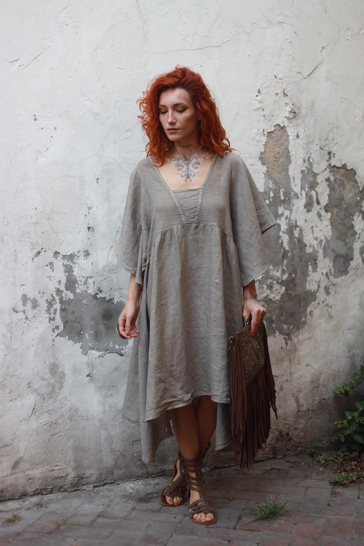 Vizon Rengi Yaka Detaylı Yarasa Kol Kısa Keten Elbise (KE-PM-065-KTN-VR-STD)